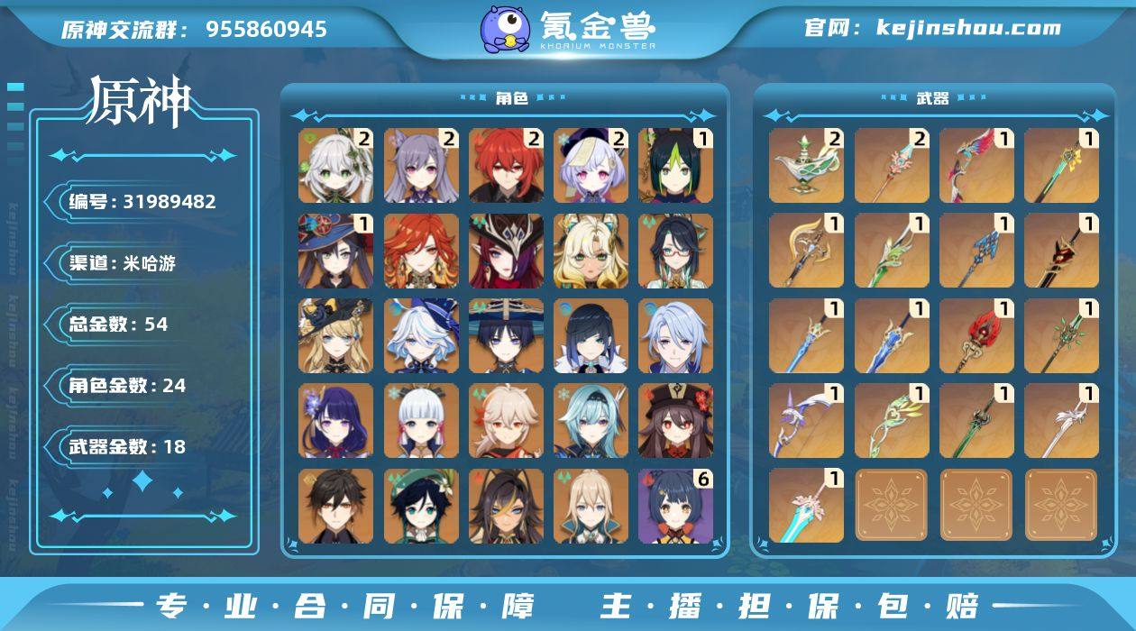 邮箱: 未绑定 总黄数: 54 冒险等级: 60 2命金色角色: 二命迪卢克,二命七七,二命刻晴,二命纳西妲 1命金色角色: 一命莫娜,一命提纳里 0命金色角色: 温迪,枫原万叶,优菈,神里绫华,钟离,琴,胡桃,雷电将军,神里绫人,夜兰,流浪者,迪希雅,芙宁娜,娜维娅,闲云,希诺宁,恰斯卡,玛薇卡 拥有武器: 和璞鸢,阿莫斯之弓,天空之傲,风鹰剑,天空之脊,磐岩结绿,护摩之杖,松籁响起之时,苍古自由之誓,息灾,赤角石溃杵,猎人之径,千夜浮梦,裁叶萃光,裁断,岩峰巡歌,星鹫赤羽 2精武器: 天空之脊,千夜浮梦 1精武器: 和璞鸢,阿莫斯之弓,天空之傲,风鹰剑,磐岩结绿,护摩之杖,松籁响起之时,苍古自由之誓,赤角石溃杵,息灾,猎人之径,裁叶萃光,裁断,岩峰巡歌,星鹫赤羽