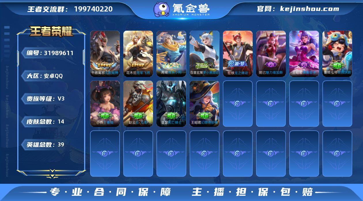【久胜战神 冠军飞将 2传说可秒换绑】安卓QQ-39英雄-14皮肤【传说皮肤】久胜战神 冠军飞将【史诗皮肤】罗小黑战记 龙之律动 魅力维加斯 偶像歌手【勇者皮肤】线条小狗 班班快跑 幻想奇妙夜 丁香结 死亡骑士 忍·炎影 营地ID:1539130146
