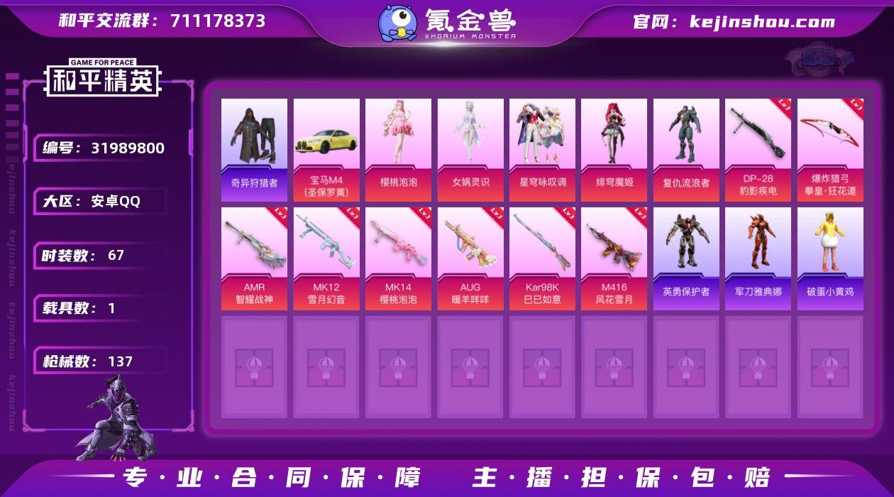 安卓 手Q-3粉装-4特效枪-1载具-0粉色飞行器-36381热力值-4王牌印记-92套装-127枪皮 【热门品类】:套装-奇异狩猎者,套装-龟仙人,角色-Mark.06 【粉色套装】:粉装-第五大道,角色-冷漠罗丽 【粉色枪皮等级】:SCAR-L-时空协奏(三级),Kar98K-巳巳如意(五级),MK12-雪月幻音(四级),DP-28-豹影疾电(五级) 【粉色载具】:仰望U9(赤霞丹朱) 【粉色枪皮】:SCAR-L-时空协奏,Kar98K-巳巳如意,MK12-雪月幻音,DP-28-豹影疾电 【粉色降落伞】:闲梦青缨降落伞,猪猪侠降落伞,祥瑞锦鲤降落伞,江南烟雨降落伞,幻彩电音降落伞,异瞳寒姬降落伞 【稀有套装】:套装-龟仙人,套装-巳巳如意,套装-雏菊兔兔,套装-萝兰蝴蝶,套装-小熊娃娃,角色-临安公主,套装-燕燕于飞,套装-鱼渊荷华,套装-霓虹热舞,角色-绛羽幽主,套装-朱霞炽焰,套装-凌霄紫焰,套装-擎苍青焰 【稀有枪皮】:AKM-破晓战魂,AKM-霓虹街区,AKM-龙的传人,M16A4-千金淑猫,SCAR-L-是爱神辣,SCAR-L-玉兔迎春,M416-糯团青竹,M416-红色方程式,GROZA-影袭,AUG-耀粉歌者,Mk47-摩登王国,蜜獾-天降萌叽,蜜獾-绯穹魔姬,ARX-凌霄紫焰,UZI-啾咪啾咪,UZI-天降萌叽,UZI-红色方程式,UMP45-炫光之旅,UMP45-生命誓言,UMP45-蓝色火焰,Vector-焰鹰斗篷,Vector-生命誓言,汤姆逊-炫彩节奏,汤姆逊-耀粉歌者,野牛-粉锦千层,AKS-74U-鬼刀,JS9-凌霄紫焰,P90-倾城蜜语,P90-巳巳如意,Kar98K-彩虹符号,Kar98K-影袭,Kar98K-红色方程式,M24-影袭,M24-幻彩电音,AWM-焰鹰斗篷,AMR-镜光幻境,M417-惊鸿侠骨,M200-惊鸿侠骨,S686-生命誓言,S686-红色方程式,S686-巳巳如意,S1897-春暖花开,S12K-玩趣呆呆,DBS-焰鹰斗篷,DBS-圣堂之誓,M249-彩虹符号,M249-糯团青竹,DP-28-焰鹰斗篷,MG3-惊鸿侠骨,MG3-摩登王国,MG-36-凌霄紫焰,P92-凌霄...