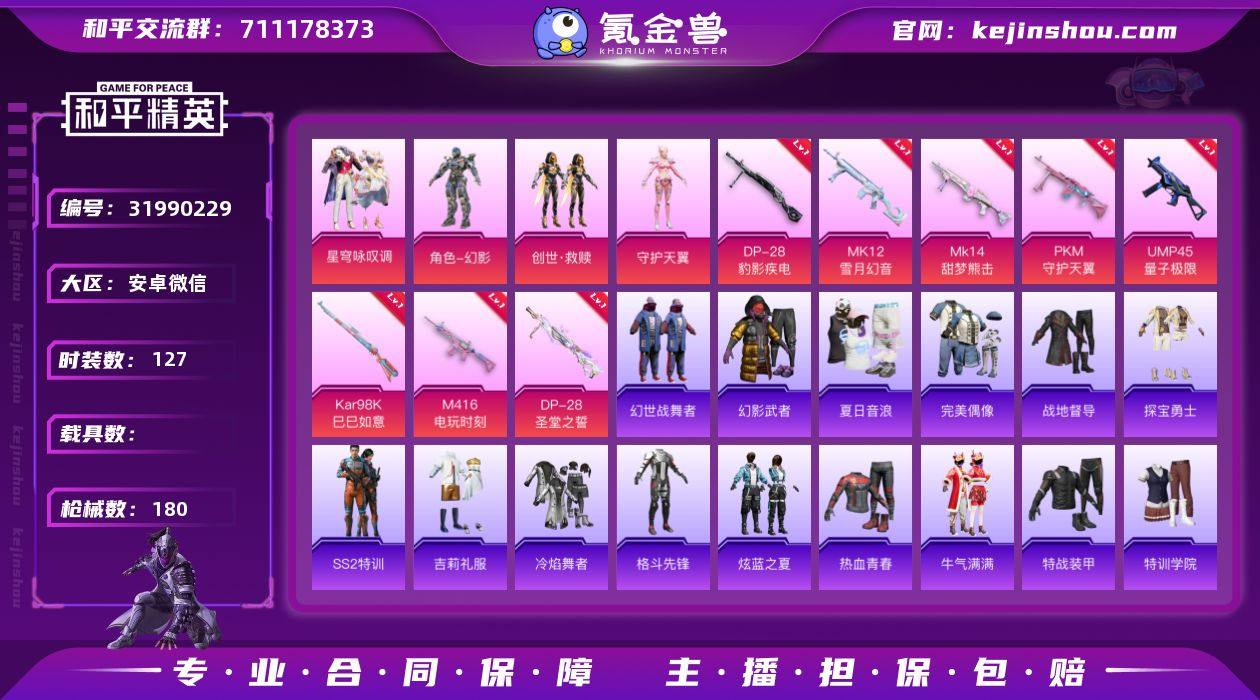 可二次【3粉装8特效枪安全保护 】 安卓V区-53480热力值-10印记-127套装-180枪皮 【3粉装】 创世·救赎 角色-守护天翼 星穹咏叹调【8特效枪】 DP-28-圣堂之誓(7级) M416-电玩时刻(5级) UMP45-量子极限(5级) MK12-雪月幻音(7级) Mk14-甜梦熊击(5级) PKM-守护天翼(7级) Kar98K-巳巳如意(5级) DP-28-豹影疾电(5级)【19热门】 长空猛禽 沙漠雄狮 霓虹街区 破蛋小黄鸡 SS27特训 SS26特训 SS25特训 SS24特训 SS23特训 SS22特训 SCAR-L-玉兔迎春 GROZA-田园牧歌 M762-天降萌叽 M762-彩虹符号 Mk47-乌木金纹 SKS-糯团青竹 DBS-彩虹符号 M249-彩虹符号 MG3-幻世战舞者【1飞行器】 炫彩糖果飞行器 营地ID:923978733