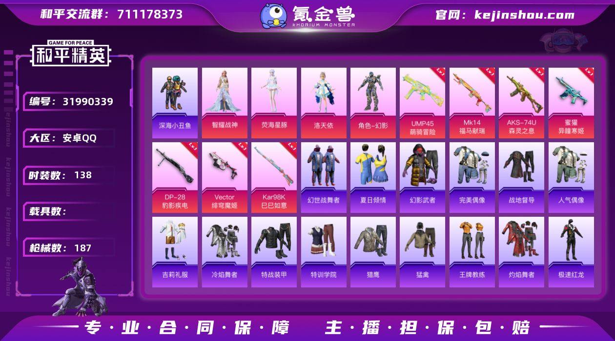 安卓 手Q-2粉装-6特效枪-0载具-1粉色飞行器-18370热力值-1王牌印记-44套装-63枪皮 【粉色套装】:角色-星渊,角色-虎痴许褚 【粉色枪皮等级】:GROZA-镜光银凌(五级),UMP45-萌骑冒险(五级),Kar98K-巳巳如意(一级),Mk14-福马献瑞(三级),DBS-幻影飞狐(四级),DP-28-豹影疾电(四级) 【粉色枪皮】:GROZA-镜光银凌,UMP45-萌骑冒险,Kar98K-巳巳如意,Mk14-福马献瑞,DBS-幻影飞狐,DP-28-豹影疾电 【粉色飞行器】:炫彩糖果飞行器 【粉色降落伞】:千金淑猫降落伞,临安公主降落伞,鬼刀降落伞,炫彩糖果降落伞 【稀有套装】:套装-巳巳如意,套装-炫彩糖果,套装-火种守卫者,套装-糖糖葫芦,套装-青团波波,角色-都市丽猫,角色-摩登魅猫,套装-燕燕于飞,套装-鱼渊荷华,套装-朱霞炽焰,套装-凌霄紫焰,角色-幽雨猫猫 【稀有枪皮】:M16A4-千金淑猫,Mk47-洛神天依,ARX-凌霄紫焰,汤姆逊-天降萌叽,JS9-凌霄紫焰,P90-巳巳如意,Mini14-耀粉歌者,S686-巳巳如意,S686-千金淑猫,DBS-第五大道,MG3-幻世战舞者,MG-36-凌霄紫焰,P92-凌霄紫焰,蝎式手枪-千金淑猫,大砍刀-黑金刀,平底锅-凌霄紫焰,破片手榴弹-巳巳如意 【其他套装】:套装-冷焰舞者,套装-完美偶像,套装-特战装甲,套装-猎鹰,套装-破蛋小黄鸡,套装-竞技名士,套装-长空猛禽,套装-黑色伏地魔,套装-暗夜傀儡 【营地ID】:952774818