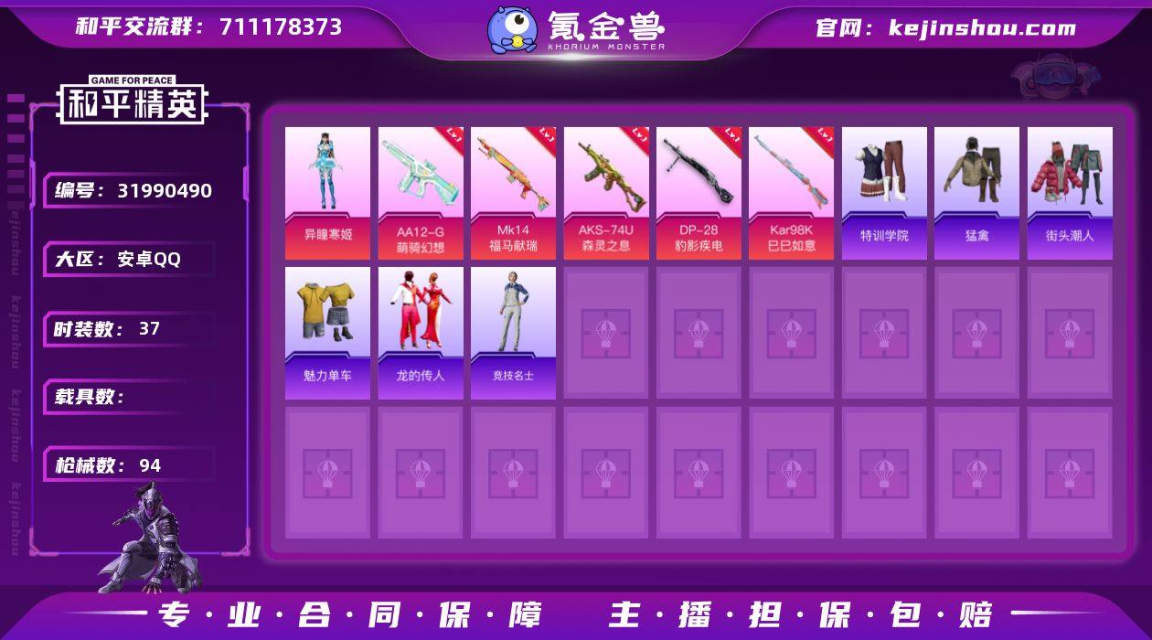 【1粉装5特效枪可秒换绑】 安卓Q区-21553热力值--37套装-94枪皮 【1粉装】 角色-异瞳寒姬【5特效枪】 Mk14-福马献瑞(5级) AA12-G-萌骑幻想(3级) AKS-74U-森灵之息(5级) Kar98K-巳巳如意(5级) DP-28-豹影疾电(5级)【7热门】 M416-蓝色火焰 长空猛禽 M762-天降萌叽 UMP45-蓝色火焰 MG3-幻世战舞者 AKM-星之彼岸【1飞行器】 炫彩糖果飞行器 营地ID:1047142989