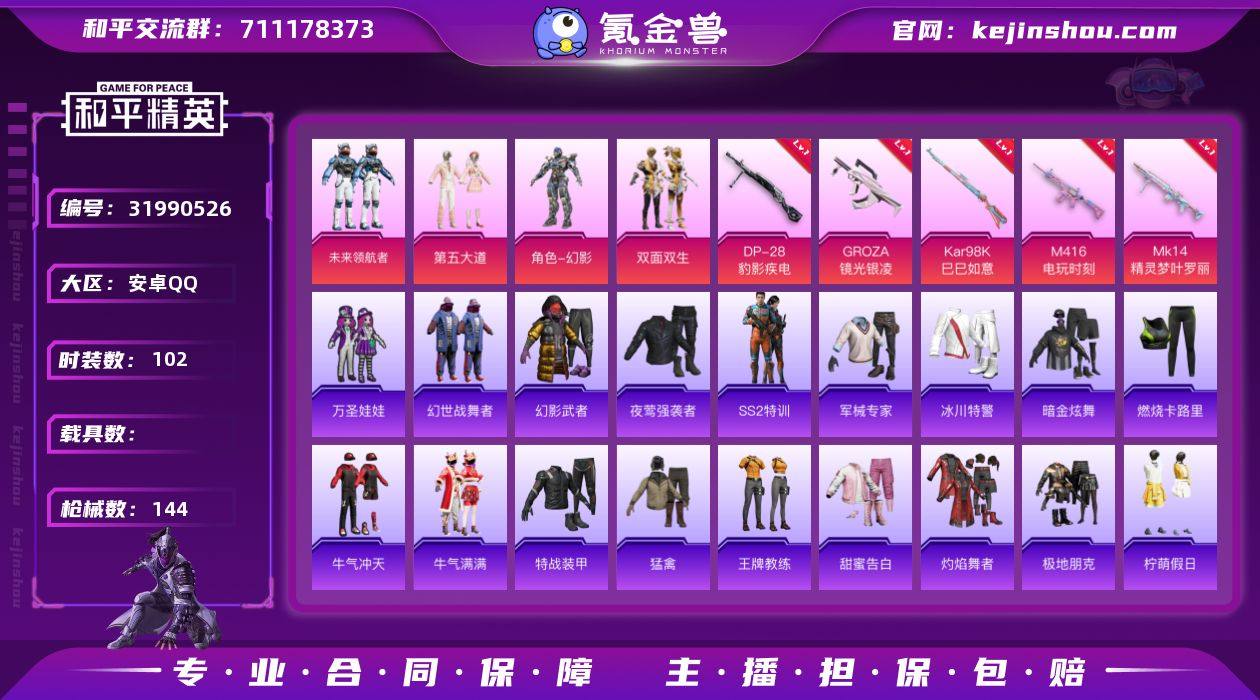 可二次【连体号 蓝螳螂 满级妹控3粉装5特效枪带王者130皮4传说可秒换绑】 安卓Q区-41161热力值-5印记-102套装-144枪皮 【1稀有】 Mark.06【3粉装】 双面双生 第五大道 套装-未来领航者【5特效枪】 M416-电玩时刻(5级) Mk14-精灵梦叶罗丽(7级) GROZA-镜光银凌(5级) Kar98K-巳巳如意(5级) DP-28-豹影疾电(5级)【25热门】 M416-蓝色火焰 GROZA-彩虹符号 QBZ-银碳小老虎 长空猛禽 牛气冲天 妙红点点 懵萌河马 团圆交子 白色伏地魔 SS25特训 SS24特训 SS23特训 SS22特训 Mark.06 SCAR-L-玉兔迎春 M762-天降萌叽 Mk47-乌木金纹 UZI-娇憨猪猪 UMP45-蓝色火焰 S12K-垂柳戏鸭 MG3-幻世战舞者 AKM-虎虎生威 万圣娃娃【2飞行器】 夏日绵绵冰飞行器 炫彩糖果飞行器 营地ID:925159155