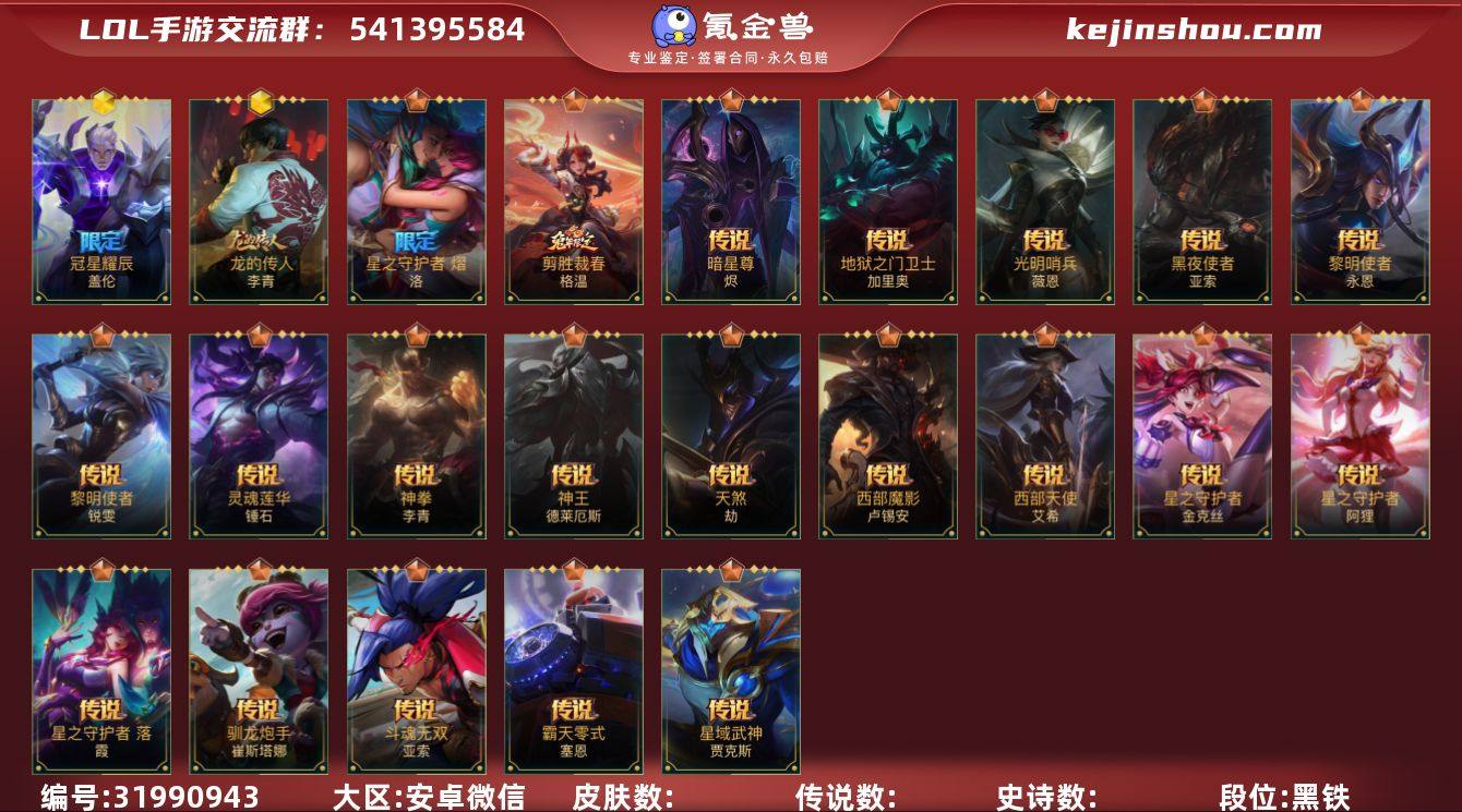 [17291042]3神话 2限定 22传说 195皮肤 可二次 可修改实名 【神话皮】乘龙破渊 李青,冠星耀辰盖伦,龙的传人 【限定皮肤】龙的传人,美猴王 【传说皮】暗星尊,海魔至尊 亚托克斯,神龙尊者 昼日真龙 亚索,地狱之门卫士,西部天使寒冰,西部魔影卢锡安,天煞劫,神王诺手,神拳盲僧,星之守护者金克丝,黎明使者锐雯,黑夜使者亚索,光明哨兵薇恩,星之守护者阿狸,星域武神贾克斯,霸天零式塞恩,斗魂无双亚索,黎明使者永恩,剪胜裁春格温,灵魂莲华锤石,驯龙炮手,星之守护者 落 【亮点】【优质装备】:暗星尊,光明哨兵薇恩,黑夜使者亚索,黎明使者锐雯,神拳盲僧,神王诺手,天煞劫,西部魔影卢锡安,西部天使寒冰,星之守护者金克丝,星之守护者阿狸,星之守护者 落,驯龙炮手,玉剑传说 武剑仙,灵魂莲华锤石,剪胜裁春格温,冠星耀辰盖伦,霸天零式塞恩,龙的传人,星域武神贾克斯,龙的传人