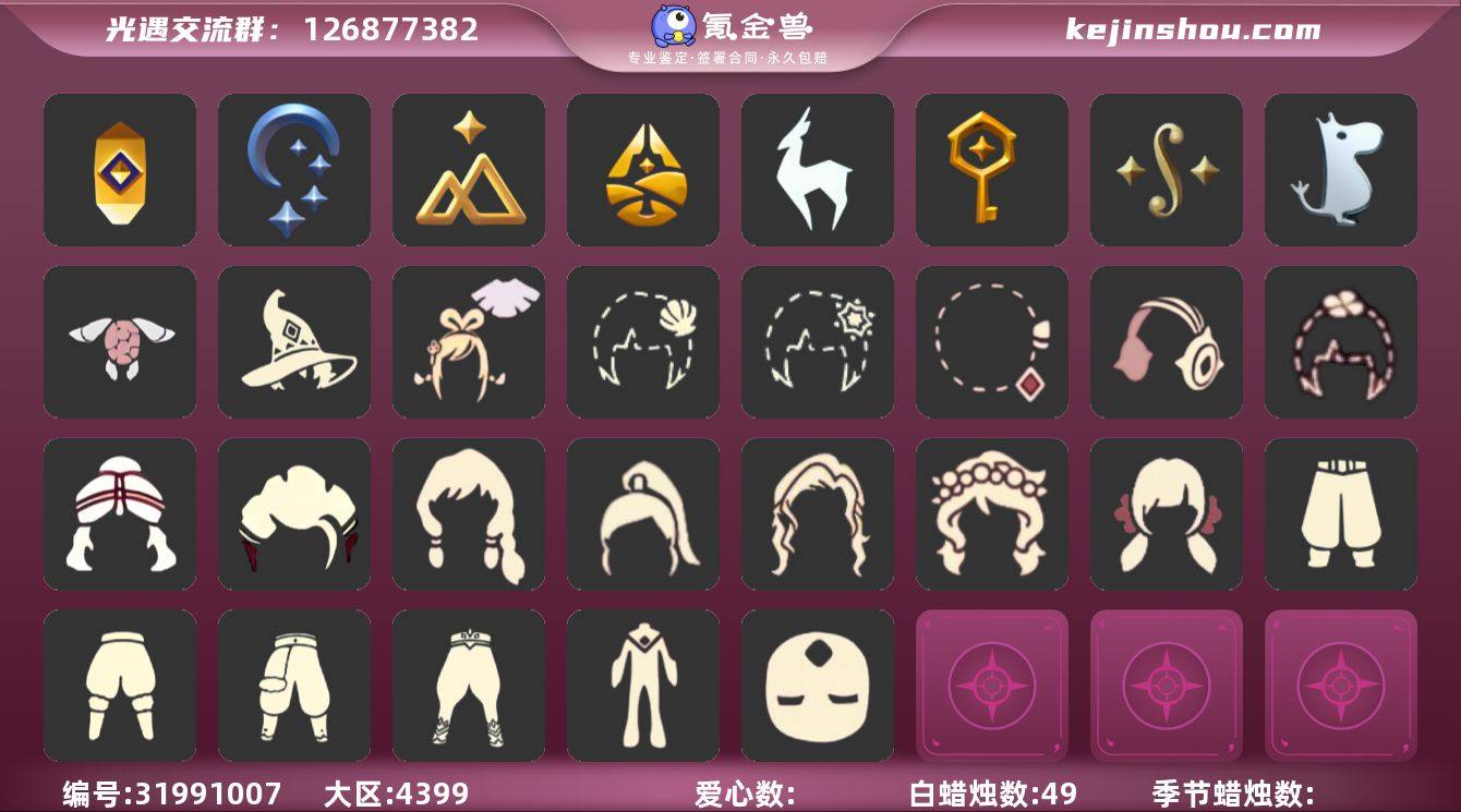 7季10翼白枭妮妮长裙王子围巾蝙蝠斗蛛网斗篷武士裤疯帽巫术犄角 资源:蜡烛891 爱心29 红烛7 翼10 已毕业地图:全图毕业 毕业季节:表演季 二重奏季 姆明季 彩染季 青鸟季 双星季 半潜海季 毕业季节物品:燕尾斗篷 黄眉企鹅面具 白枭发型 合奏挂画 蓝色燕尾服 白色高脚钢琴 姆明抱枕 姆明大伞 姆明长裙 彩染围巾斗篷 辉光羚羊面具 青鸟面饰 青鸟斗篷 蓝色星星光环 暮星斗篷 稀有礼包:玉兔拖鞋 巫师帽 雪花发饰 巫术犄角 四叶草 王子围巾 蝙蝠斗 蛛网斗篷 献瑞折扇礼包 热门裤子:妮妮长裙 海洋武士裤 白棉裤 武士裤 小丑服 女仆围裙 红色流珠裙 米色西装裤 热门面具:矮人面具 黄鼠狼面具 黄眉面具 一字眉 盲僧眼罩 向导面具 青鸟面具 玫瑰花面具 黑脸 鸟羽面具 热门发型:海藻头 爆炸头 大胡子 小飞象 雨妈 卡卡 平菇 龙骨 公主头 水母头 书虫 正太 高马尾 明制帽 斗笠 绿丝带 虚荣 白枭 樱花头 南瓜头 巫师帽 女巫发型 疯帽 光头 热门头饰:飞羽发饰 双星季面饰 花环 雪花发饰 四叶草 红耳机 辫子发饰 巫术犄角 热门斗篷:五角星斗篷 黑金斗篷 白金斗篷 蝴蝶斗篷 王子围巾 燕尾斗篷 小浣熊斗篷 双排扣斗篷 史力奇斗篷 姆明季斗篷 镂空斗篷 镂空三条斗 星空斗篷 鸟羽斗篷 双星季斗篷 衔福献瑞斗篷 樱花斗篷 海洋斗篷 漩涡斗篷 彩虹斗篷 蝙蝠斗 蛛网斗篷 热门背饰:号角 相机 红色雨伞 献瑞折扇礼包 椅子 星星灯 女巫茶桌 三角钢琴 姆明季抱枕 二重奏壁画 " 【毕业地图】:晨岛,云野,雨林,霞谷,暮土,禁阁