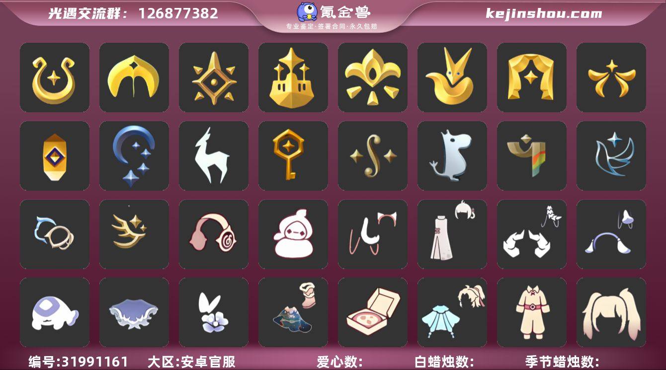账号类型: 邮箱账号 季节已毕业: 魔法季,圣岛季,预言季,梦想季,小王子季,表演季,欧若拉季,集结季,夜行季,追忆季,九色鹿季,筑巢季,二重奏季,姆明季,彩染季,青鸟季,双星季,迁徙季 完成地图: 晨岛,云野,雨林,霞谷,暮土,禁阁,全图毕业 珍稀物品: 阿努比斯(狗头),白枭,透明蝶翼斗,魔法季耳坠,玫瑰花 礼包: 蝙蝠套,巫师,围巾,欧若拉之翼,九色鹿角,莲花斗,大耳狗抱枕,绊爱,鹿角,蜘蛛斗,牛仔裤,兔子鞋,大耳狗发饰,运动鞋,秋千,白绒金,瑞雪,福娃,跷跷板,小船,吉他,灯笼,人声乐器,彩虹帽,橘子,贝壳,黄伞,红伞,兔子,南瓜,鲤鱼,电吉他,tgc,猫套,猫背饰,星月头饰,彩虹耳钉,彩虹耳机,新年裤,蝴蝶结,魔法棒,奥利奥,四叶草,暗彩装扮,拖鞋,爱心眼镜,火焰眼镜,雪人鞋,新年耳钉,龙纹斗,浪漫流星斗,创始人,海蓝波浪发型,飞鸟纸伞,满月耳坠,月华套装,锦标赛桂冠,线框斗,优雅三件套,姆明饰品套装,史力奇套装,史力奇帽子,树精肩饰,向日葵连衣裙,龙鳞束身长袍,衔福献瑞礼包,献瑞折扇礼包,渐变双马尾发型礼包,心心相印发饰礼包,小狗周年发饰,宝藏猎人礼包,潮汐套装礼包,粽子发饰礼包,必胜客联动分享披萨背饰礼包,青衫落拓礼包,周年影院套餐礼包,蝴蝶与花发饰礼包,暗陨斗篷礼包,小海牛配饰礼包,活力海牛礼包,冥龙套装礼包,鹊桥相会套装,皮皮猫套装礼包,小雪人头饰,云音伴游耳机 裤子: 武士裤,背带裤,白棉裤,搓澡巾 面具: 黄鼠狼,红狐狸,阿努比斯 面饰: 魔法季耳坠,红耳机,黑框眼镜 项链: 围巾 发型: 蝴蝶结,正太,樱花,公主头,虚荣,猫耳,白枭 头饰: 花环 斗篷: 白金,红金,白鸟斗,花瓣斗篷,荧蓝斗篷 配饰: 雨伞,排箫,高音钢琴,吉他,笛子,大铃铛乐器,乐器 亮点: 重塑药水30,有织光季季卡