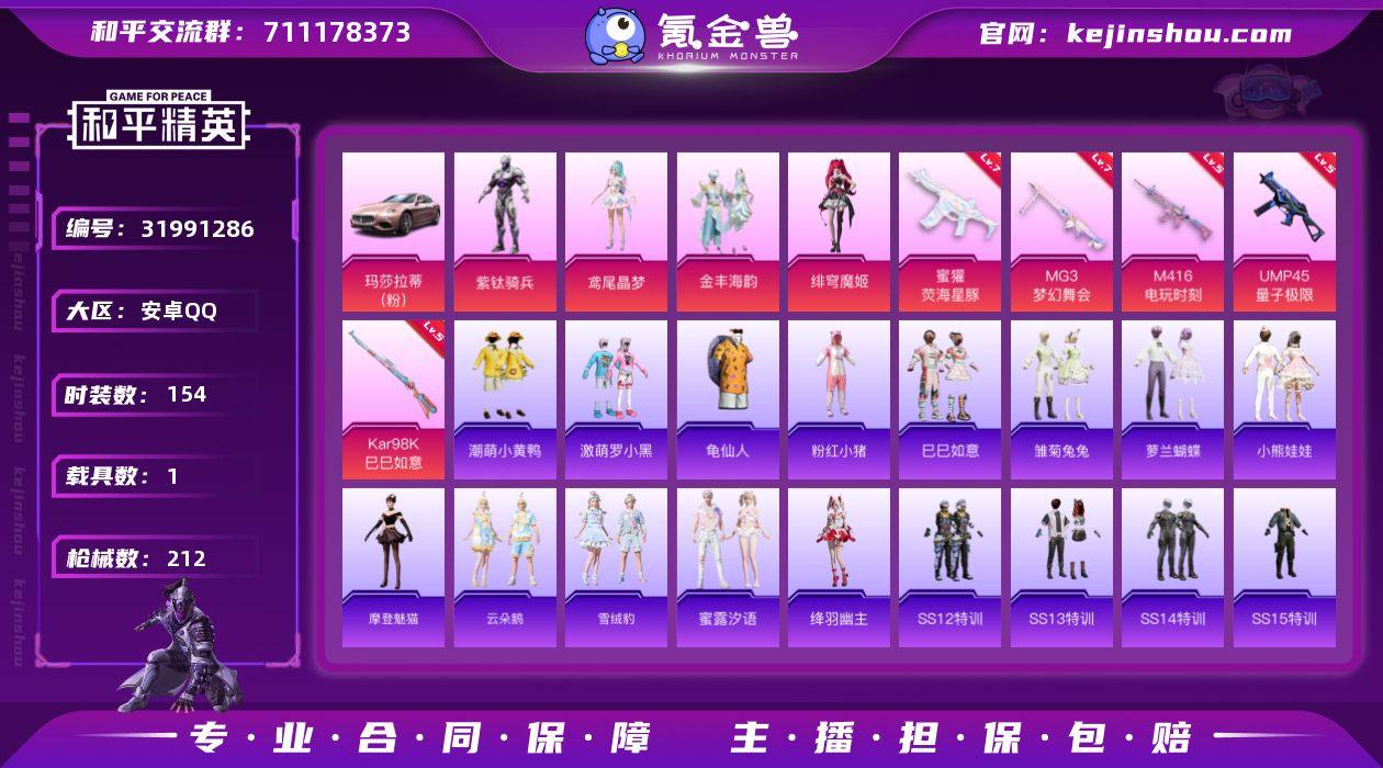 【ky465】安卓 手Q-4粉装-7特效枪-1载具-3粉色飞行器-66964热力值-14王牌印记-154套装-212枪皮 【热门品类】:套装-龟仙人,套装-潮萌小黄鸭,套装-粉红小猪 【粉色套装】:角色-紫钛骑兵,角色-鸢尾晶梦,粉装-金丰海韵,角色-绯穹魔姬 【粉色枪皮等级】:M416-电玩时刻(五级),蜜獾-荧海星豚(七级),UMP45-量子极限(五级),AKS-74U-森灵之息(五级),Kar98K-巳巳如意(五级),Mk14-福马献瑞(五级),MG3-梦幻舞会(七级) 【粉色载具】:玛莎拉蒂Ghibli(粉) 【粉色枪皮】:M416-电玩时刻,蜜獾-荧海星豚,UMP45-量子极限,AKS-74U-森灵之息,Kar98K-巳巳如意,Mk14-福马献瑞,MG3-梦幻舞会 【粉色飞行器】:炫彩糖果飞行器,鸢尾晶梦飞行器 【粉色降落伞】:绝对恒星降落伞,金风玉露降落伞,阿狸红降落伞,银刃赛罗降落伞,洛神天依降落伞,蓝莓炮弹降落伞,碧影闪光降落伞,彩虹甜喵降落伞,旋转彩虹降落伞,熔岩统帅降落伞,精灵梦叶罗丽降落伞,鸢尾晶梦降落伞,荧海星豚降落伞,炫彩糖果降落伞 【稀有套装】:套装-龟仙人,套装-巳巳如意,套装-炫彩糖果,套装-雏菊兔兔,套装-萝兰蝴蝶,套装-小熊娃娃,角色-摩登魅猫,套装-云朵鹅,套装-雪绒豹,套装-蜜露汐语,角色-绛羽幽主,角色-月烬之祷 【稀有枪皮】:AUG-冰晶雪宝,AKM-夜灯,AKM-彩虹符号,AKM-生命誓言,AKM-破晓战魂,AKM-萌趣颜团子,AKM-虎虎生威,AKM-霓虹街区,AKM-玄冥寒域,M16A4-幻世战舞者,M16A4-蓝色火焰,SCAR-L-炫彩节奏,SCAR-L-玉兔迎春,SCAR-L-红色方程式,SCAR-L-龙宫之主,M416-夜灯,M416-糯团青竹,M416-红色方程式,M416-蓝色火焰,GROZA-彩虹符号,GROZA-懵萌河马,GROZA-治愈之星,GROZA-田园牧歌,GROZA-蓝莓炮弹,GROZA-荧海星豚,AUG-天降萌叽,AUG-耀粉歌者,AUG-绝对恒星,QBZ-彩虹符号,QBZ-洛神天依,M762-天降萌...