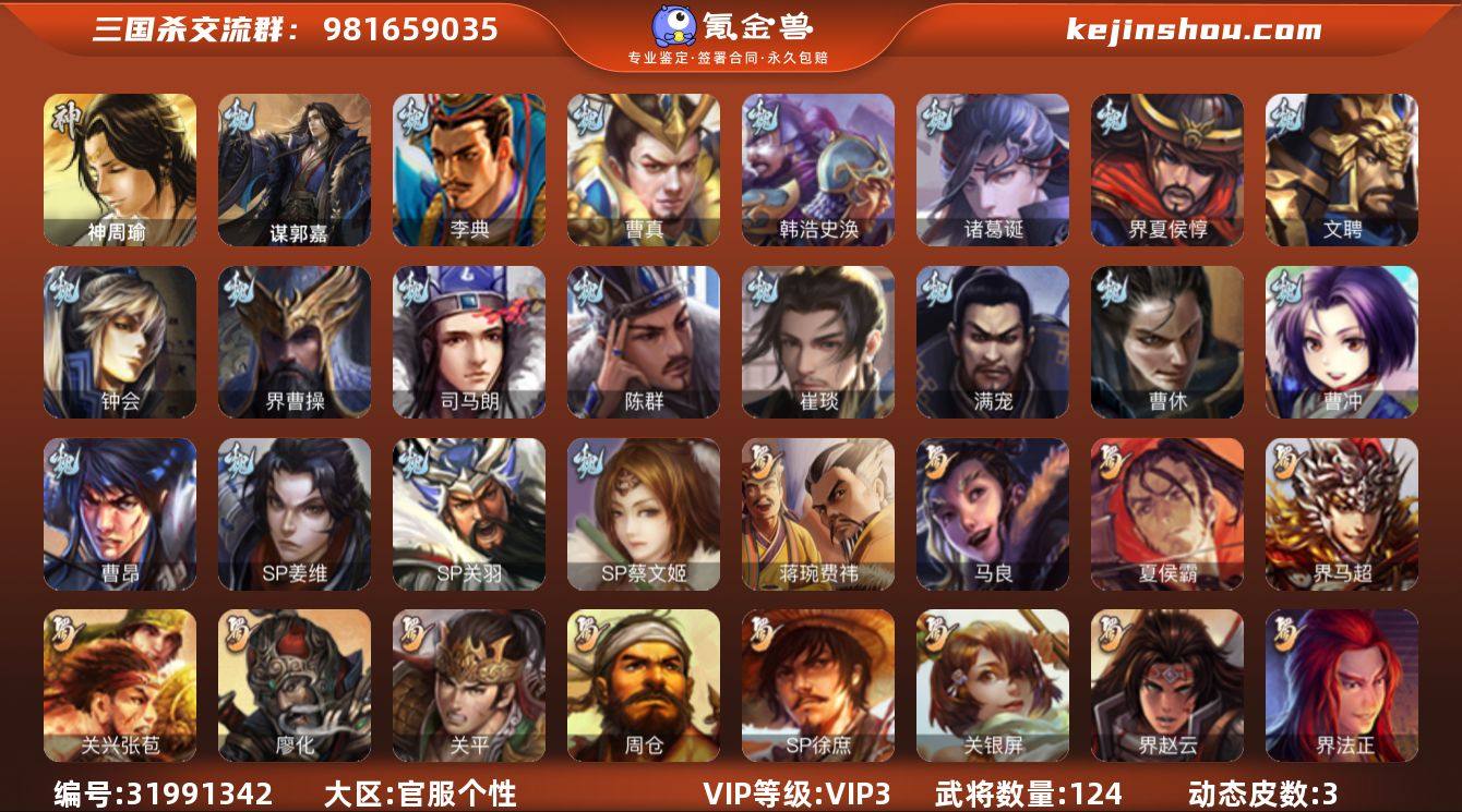 官阶:先锋将军;VIP等级:VIP3;史诗武将数量:2;动态皮肤数量:3;武将总数:124;史诗宝珠数量:0;将魂数量:1195;神将:0;魏国史诗武将:2;蜀国史诗武将:0;吴国史诗武将:1;群史诗武将:1 孙寒华,郑玄,神周瑜,SP关羽,SP蔡文姬,曹昂,诸葛诞,文聘,SP姜维,钟会,曹冲,满宠,界曹操,界夏侯惇,李典,曹真,韩浩史涣,陈群,曹休,司马朗,崔琰,谋郭嘉,关银屏,夏侯霸,马良,关兴张苞,廖化,关平,界法正,界赵云,界马超,SP徐庶,吴懿,周仓,严颜,胡金定,刘巴,谋庞统,蒋琬费祎,孙鲁育,程普,韩当,潘璋马忠,界甘宁,界黄盖,界周瑜,界大乔,界陆逊,孙鲁班,顾雍,界孙权,潘濬,陈武董袭,界孙鲁班,界孙休,伏完,界袁术,张宝,伏皇后,李儒,华雄,袁术,界华佗,界刘表,界公孙瓒,羊祜,谋高顺,势田丰,乐就,曹冲-龙年清明(动态),周处-义除三害(动态),孙寒华-莲华熠熠(动态),孙寒华-蛇年限定(动态)