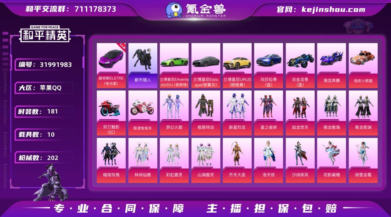 苹果 手Q-32粉装-14特效枪-10载具-5粉色飞行器-107053热力值-13王牌印记-181套装-202枪皮 【红色载具】:路特斯ELETRE(电光紫)(六级) 【热门品类】:粉装-梦幻火箭,套装-都市猎人,套装-小丑鱼,角色-军刀雅典娜,套装-金羽特工,套装-粉红小猪 【粉色套装】:粉装-极限特训,粉装-梦幻火箭,粉装-新星烈龙,粉装-星之彼岸,粉装-焰龙焚天,粉装-银龙傲海,粉装-骨龙祭渊,粉装-暗夜玫瑰,粉装-林间仙鹿,粉装-彩虹鹿灵,粉装-山涧鹿灵,粉装-齐天大圣,角色-洛天依,粉装-沙场疾风,粉装-花影阑珊,粉装-俏雪含霜,粉装-吟月归客,粉装-红伞翩翩,粉装-黄伞悠悠,粉装-海渊国主,角色-初号机款机体服,粉装-蓝莓炮弹,粉装-甜心娃娃,粉装-精灵娃娃,粉装-酣梦娃娃,粉装-暗星紫秘,粉装-焦糖拿铁,粉装-碧影闪光,粉装-岚岚物语,粉装-恐龙拽拽,角色-复仇流浪者,女娲后裔-赵灵儿 【粉色枪皮等级】:SCAR-L-青春物语(四级),M416-风花雪月(七级),UMP45-恐龙拽拽(五级),Vector-环太平洋(五级),AKS-74U-森灵之息(五级),Kar98K-巳巳如意(五级),M24-暗星紫秘(三级),Mk14-福马献瑞(五级),SLR-暗夜玫瑰(三级),S12K-海渊国主(五级),M249-蓝莓炮弹(四级),DP-28-豹影疾电(五级),MG3-洛神天依(五级),PKM-萌骑夺宝(五级) 【粉色载具】:路特斯ELETRE(电光紫),兰博基尼Aventador SVJ(翡翠绿),兰博基尼Estoque(银翼灰),兰博基尼URUS(明艳黄),玛莎拉蒂Ghibli(蓝),合金龙骨(蓝),海龙奔腾,俏皮小熊猫,双人摩托-双刃魅影(红),极速兔兔车 【粉色枪皮】:SCAR-L-青春物语,M416-风花雪月,UMP45-恐龙拽拽,Vector-环太平洋,AKS-74U-森灵之息,Kar98K-巳巳如意,M24-暗星紫秘,Mk14-福马献瑞,SLR-暗夜玫瑰,S12K-海渊国主,M249-蓝莓炮弹,DP-28-豹影疾电,MG3-洛神天依,PKM-萌骑夺宝 【...