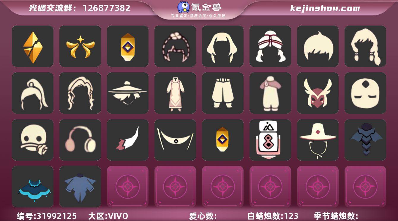 8季白枭武士裤星月头冠圣诞鹿角彩虹耳机冥龙号角巫师帽详情看图价格可谈 资源:蜡烛700 爱心5 红烛90 翼10 已毕业地图:雨林 霞谷 毕业季节:潜海季 表演季 破晓季 欧若拉 追忆季 夜行季 归巢季 半拾光 稀有礼包:巫师帽 橘子发饰 玉兔发卡 星月头冠 彩虹耳钉 彩虹耳机 圣诞鹿角 白雪斗篷 冥龙号角 热门裤子:背带裤 遥鲲长裙 绑带舞服 墨绿长裤 海浪阔腿裤 白棉裤 搓澡巾 紧身连体衣 武士裤 小丑服 女仆围裙 米色西装裤 热门面具:矮人面具 黄鼠狼面具 潜海面具 黄眉面具 一字眉 棕熊面具 盲僧眼罩 龙头 玫瑰花面具 玫瑰面具 黑脸 粽叶发带 黑框眼镜 热门发型:海草头 爆炸头 雨妈 卡卡 平菇 蝴蝶结 公主头 粗辫 水母头 书虫 总裁头 正太头 高马尾 明制帽 郡主头 斗笠 绿丝带 虚荣 白枭 圆环发辫 留辫蘑菇头 李逍遥发型 彩色脏辫 彩羽发型 樱花头 猫耳 女巫发型 巫师帽 热门头饰:花环 珊瑚发饰 蓝色音乐节 红耳机 单边发饰 橘子发饰 玉兔发卡 星月头冠 彩虹耳钉 彩虹耳机 圣诞鹿角 热门斗篷:五星斗篷 红金斗篷 黑金斗篷 蝴蝶斗篷 汉服斗篷 燕尾服斗篷 暗花斗篷 冥龙斗篷 遥鲲长豆 展翼圆环斗篷 透明蝶翼 小浣熊斗篷 绒毛斗篷 布丁斗篷 布条斗篷 镂空斗篷 樱花斗篷 马蹄莲斗篷 地球日斗篷 海洋斗篷 旋涡斗篷 彩虹斗篷 暗彩斗篷 白雪斗篷 热门背饰:追忆围巾 相机 吊床 星星灯 鲲灯 女巫茶桌 粽叶吊床 冥龙号角,归巢季,潜海季,表演季,破晓季,欧若拉季,追忆季,夜行季