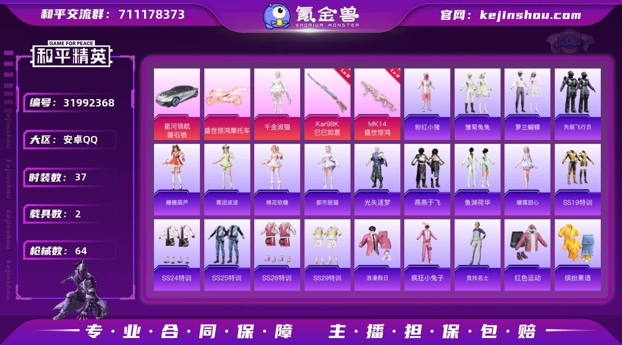 安卓 手Q-1粉装-2特效枪-2载具-1粉色飞行器-19390热力值-2王牌印记-37套装-64枪皮 【热门品类】:套装-粉红小猪 【粉色套装】:角色-千金淑猫 【粉色枪皮等级】:Kar98K-巳巳如意(五级),Mk14-盛世惊鸿(三级) 【粉色载具】:星河领航(磐石银),盛世惊鸿摩托车 【粉色枪皮】:Kar98K-巳巳如意,Mk14-盛世惊鸿 【粉色飞行器】:凤舞九天飞行器 【粉色降落伞】:沙丘之主降落伞,拳皇·狂花道降落伞,千金淑猫降落伞,月影灵韵降落伞,盛世惊鸿降落伞,赛博古神降落伞 【稀有套装】:套装-雏菊兔兔,套装-萝兰蝴蝶,套装-先驱飞行员,套装-糖糖葫芦,套装-青团波波,套装-棉花软糖,角色-都市丽猫,角色-光矢逐梦,套装-燕燕于飞,套装-鱼渊荷华,角色-糖霜甜心 【稀有枪皮】:AKM-破晓战魂,AKM-龙的传人,AKM-玄冥寒域,M16A4-幻世战舞者,SCAR-L-炫彩节奏,M416-糯团青竹,GROZA-彩虹符号,GROZA-林间仙鹿,AUG-耀粉歌者,M762-天降萌叽,Mk47-林间仙鹿,UZI-盛世惊鸿,Vector-银河战甲,汤姆逊-樱桃泡泡,P90-巳巳如意,Kar98K-红色方程式,AWM-黄金龙骨,AWM-盛世惊鸿,Mini14-炫彩节奏,SLR-墨龙九天,S686-巳巳如意,S686-千金淑猫,DBS-月影灵韵,DBS-净心行者,M249-破晓战魂,DP-28-彩虹符号,大砍刀-盛世惊鸿,破片手榴弹-巳巳如意 【其他套装】:套装-SS19特训,套装-SS24特训,套装-SS25特训,套装-SS26特训,套装-SS29特训,套装-浪漫假日,套装-疯狂小兔子,套装-竞技名士,套装-粉红小猪,套装-红色运动,套装-缤纷果语,套装-蓝彩潮人,套装-蓝色运动,套装-街头潮人,套装-酒红色名流,套装-长空猛禽,套装-魅力单车 【稀有头盔】:金羽特工头盔(3级) 【稀有背包】:金羽特工背包(3级),金羽特工背包(2级) 【营地ID】:1034229425