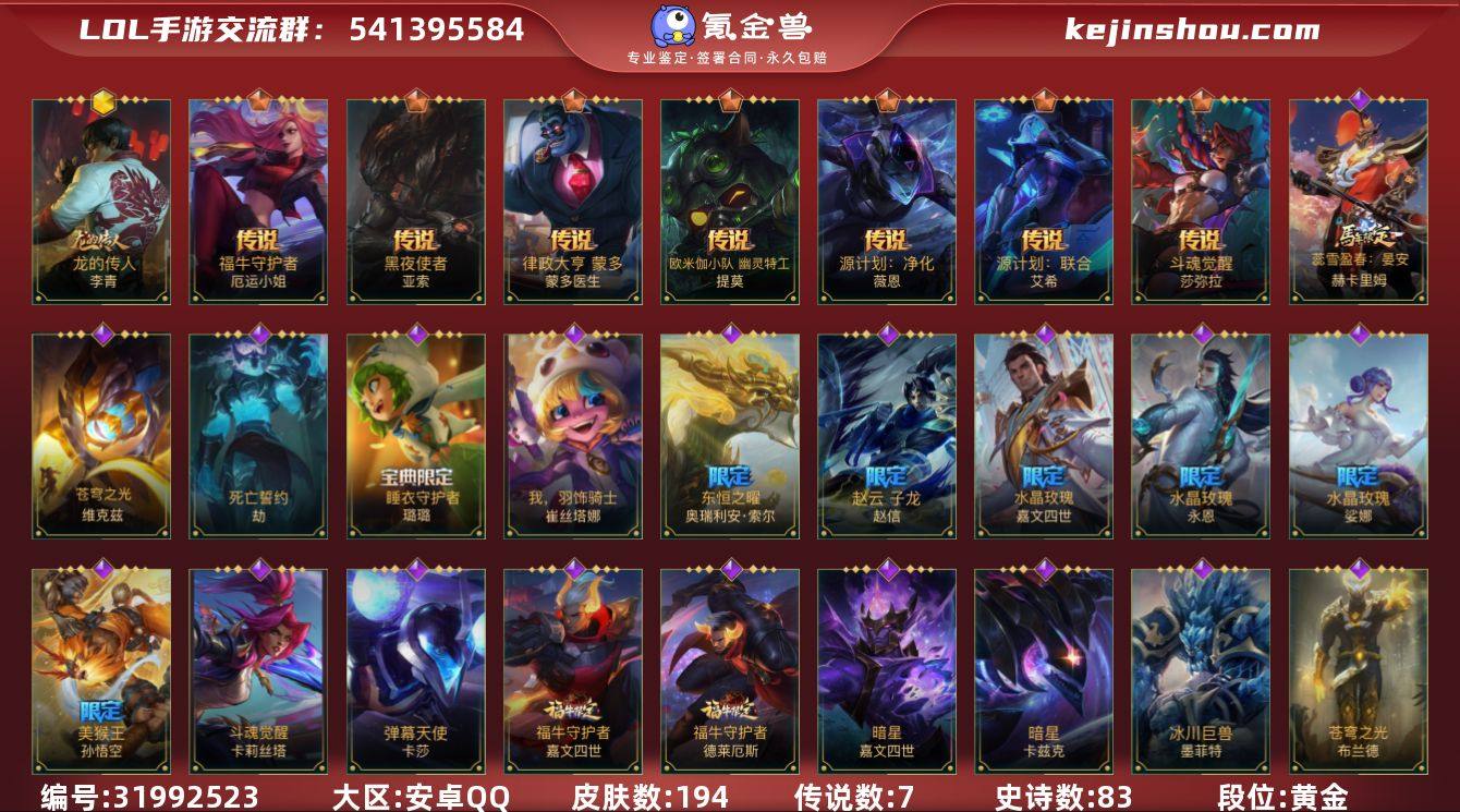 实名: 可修改 段位: 黄金 皮肤数: 194 神话皮: 龙的传人 限定皮肤: 龙的传人,美猴王,水晶玫瑰永恩,水晶玫瑰皇子,水晶玫瑰琴女,关羽云长,赵云子龙,冬季仙境发条 传说皮: 福牛守护者女枪,黑夜使者亚索,律政大亨,欧米伽小队 幽灵特工,源计划:净化,源计划:联合,斗魂觉醒 莎弥拉 亮点: 【优质装备】:福牛守护者女枪,黑夜使者亚索,律政大亨,欧米伽小队 幽灵特工,源计划:净化,源计划:联合,玉剑传说 武剑仙,龙的传人,龙的传人,斗魂觉醒 莎弥拉