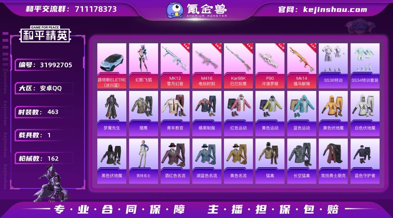 实名: 可修改 时装数: 463 载具数: 1 枪械数: 162 战备数: 1 热门装扮: 梦魇先生,幻影飞狐 载具: 路特斯ELETRE(冰川蓝) 稀有枪皮: M416电玩时刻,Kar98K-巳巳如意,MK12-雪月幻音,P90-冷漠罗丽,MK14-福马献瑞
