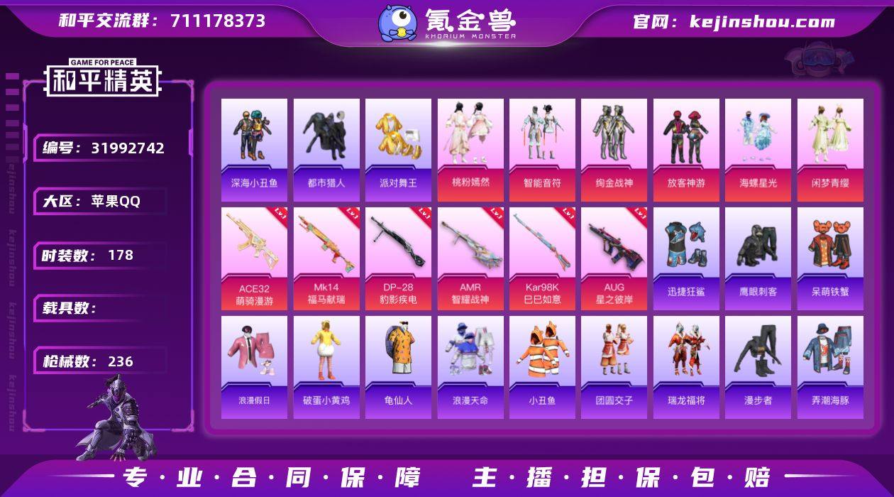 XY 苹果手Q素材号【小丑乔克/紫螳螂/新星烈龙/胖达圆圆】-5粉装-2特效枪-0载具-3粉色飞行器-51815热力值-13王牌印记-147套装-166枪皮 【热门品类】:粉装-怪诞乔克,套装-胖达圆圆,套装-金羽特工,套装-动感兔斯基人偶服,套装-龟仙人,套装-暗影哥特,套装-粉红小猪 【粉色套装】:粉装-怪诞乔克,粉装-新星烈龙,角色-初号机款机体服,粉装-未来歌姬,粉装-星穹咏叹调 【粉色枪皮等级】:M416-风花雪月(七级),Kar98K-巳巳如意(五级) 【粉色枪皮】:M416-风花雪月,Kar98K-巳巳如意 【粉色飞行器】:黄族统领飞行器,萌物绒绒飞行器 【粉色降落伞】:海渊国主降落伞,环太平洋降落伞,垂柳戏鸭降落伞,旋转彩虹降落伞,黄族统领降落伞,未来歌姬降落伞,莲影清波降落伞 【稀有套装】:套装-龟仙人,套装-巳巳如意,套装-燕燕于飞,套装-鱼渊荷华,角色-风玲 【稀有枪皮】:AKM-彩虹符号,AKM-灼热熔岩,AKM-破晓战魂,AKM-虎虎生威,AKM-霓虹街区,AKM-龙的传人,M16A4-幻世战舞者,M16A4-甜心亚梦,SCAR-L-兔兔白日梦,SCAR-L-炫彩节奏,SCAR-L-玉兔迎春,M416-糯团青竹,M416-绯红前夜,M416-罗小黑,GROZA-异彩先驱,GROZA-懵萌河马,AUG-天降萌叽,AUG-耀粉歌者,AUG-闲梦青缨,QBZ-妙趣可丽,QBZ-飞驰魅影,M762-天降萌叽,M762-瑞龙福将,M762-绯红前夜,Mk47-妙红点点,Mk47-炫光之旅,G36C-懵萌河马,AC-VAL-天降萌叽,AC-VAL-快闪甜心,AC-VAL-甜心亚梦,蜜獾-娇憨猪猪,UZI-啾咪啾咪,UZI-天降萌叽,UZI-娇憨猪猪,UZI-红色方程式,UMP45-繁龙极客,UMP45-时空追击者,UMP45-涂山之恋,UMP45-生命誓言,UMP45-金玉无双,Vector-焰鹰斗篷,Vector-彩虹符号,Vector-生命誓言,Vector-音爆索尼克,汤姆逊-天降萌叽,汤姆逊-奇异狩猎者,汤姆逊-异彩先驱,汤姆逊-炫彩节奏,汤姆逊-环太平洋,MP...