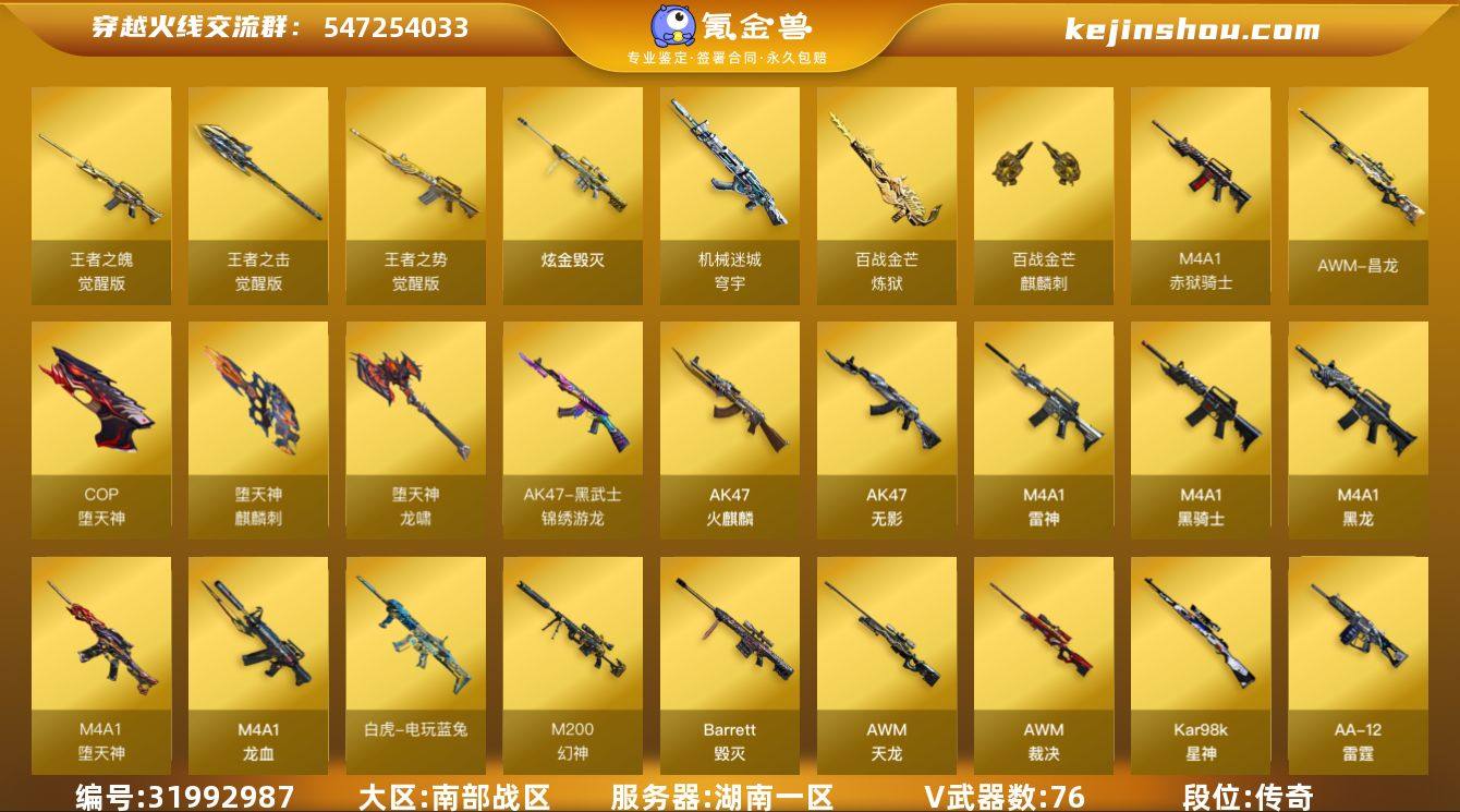 湖南一区-84V-3王者武器数-1炫金武器数 【热门武器】:QBZ03-金色蔷薇,M200-幻神,白虎-电玩蓝兔,Kar98K-星神,M4A1-黑骑士,汤姆逊-烈龙*6,RPK-盘龙*2,斯泰尔-蝴蝶,COP-白鲨,COP-堕天神*3,沙鹰-修罗*4,荣耀世冠-龙啸 【王者炫金武器】:炫金毁灭 【音效卡】:AK47-火麒麟音效卡,M4A1-雷神音效卡,M4A1-黑骑士音效卡,Barrett-毁灭音效卡,Barrett-碧霄极光音效卡*4,麒麟刺-百战金芒-盛典舞曲音效卡,炼狱-百战金芒-庆典舞曲音效卡,AWM-昌龙-怀旧音效卡 【皮肤】:幻神-AG-CFPLS17冠军,雷神-虎将,雷神-耀金皮肤,雷神-烈虎皮肤,M4A1-再燃火线,传奇石头-横秒之巅,火麒麟-平天大圣,毁灭耀金皮肤,毁灭-冠军之怒,黑龙-能量核心,黑骑士耀金皮肤,无影-能量核心,战神-粉色甜心皮肤,战神-紫绶金章皮肤,战神-流金岁月皮肤,AWM-天龙-传奇70KG*2,轻型军用手斧-再燃火线 【角色】:瞳,炫,零·纪元,战地猎狐,葵-阿尔法武装,暗夜-X,初恋灵狐,芳心审判者,风暴女*2,虎妞,嘉年华灵狐,灵狐者-X,灵狐者-职业经理,龙儿-小淘气,潘多拉-X,蜀雪,铁骑荣耀,雪莉杨-摸金校尉,雅典娜 【人偶武器】:COP-白鲨,斯泰尔-蝴蝶,巴雷特-零-水下丽影,AWM-灵狐-15周年嘉年华,夺魂,迷你牛牛,闪光弹-小乔,迷你巨石泰坦-魔花研究所,灵狐娃娃手雷 【暴走生化】:超级对讲机 【挑战大师】:冰龙粉碎者-白马银枪,激光毁灭者III 【英雄级武器】:AK47-火麒麟,M4A1-黑龙,M4A1-雷神*2,M4A1-黑骑士,AK47-无影,M4A1-龙血,M4A1-堕天神,黑武士-锦绣游龙,QBZ03-金色蔷薇,王者之魄-觉醒版,王者之势-觉醒版,AK47-B-战神,白虎-电玩蓝兔,机械迷城-穹宇,AWM-天龙,Barrett-毁灭*2,AWM-裁决,M200-幻神,Kar98K-星神,RPK-盘龙*2,炼狱-百战金芒,汤姆逊-烈龙*6,AA-12-雷霆,沙鹰-修罗*4,COP-堕天神*...