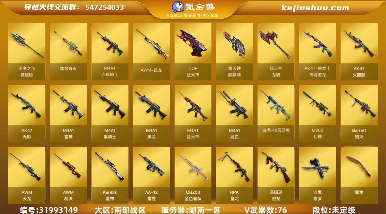 湖南一区-84V-3王者武器数-1炫金武器数 【热门武器】:QBZ03-金色蔷薇,M200-幻神,白虎-电玩蓝兔,Kar98K-星神,M4A1-黑骑士,汤姆逊-烈龙*6,RPK-盘龙*2,斯泰尔-蝴蝶,COP-白鲨,COP-堕天神*3,沙鹰-修罗*4,荣耀世冠-龙啸 【王者炫金武器】:炫金毁灭 【音效卡】:AK47-火麒麟音效卡,M4A1-雷神音效卡,M4A1-黑骑士音效卡,Barrett-毁灭音效卡,Barrett-碧霄极光音效卡*4,麒麟刺-百战金芒-盛典舞曲音效卡,炼狱-百战金芒-庆典舞曲音效卡,AWM-昌龙-怀旧音效卡 【皮肤】:幻神-AG-CFPLS17冠军,雷神-虎将,雷神-耀金皮肤,雷神-烈虎皮肤,M4A1-再燃火线,传奇石头-横秒之巅,火麒麟-平天大圣,毁灭耀金皮肤,毁灭-冠军之怒,黑龙-能量核心,黑骑士耀金皮肤,无影-能量核心,战神-粉色甜心皮肤,战神-紫绶金章皮肤,战神-流金岁月皮肤,AWM-天龙-传奇70KG*2,轻型军用手斧-再燃火线 【角色】:瞳,炫,零·纪元,战地猎狐,葵-阿尔法武装,暗夜-X,初恋灵狐,芳心审判者,风暴女*2,虎妞,嘉年华灵狐,灵狐者-X,灵狐者-职业经理,龙儿-小淘气,潘多拉-X,蜀雪,铁骑荣耀,雪莉杨-摸金校尉,雅典娜 【人偶武器】:COP-白鲨,斯泰尔-蝴蝶,巴雷特-零-水下丽影,AWM-灵狐-15周年嘉年华,夺魂,迷你牛牛,闪光弹-小乔,迷你巨石泰坦-魔花研究所,灵狐娃娃手雷 【暴走生化】:超级对讲机 【挑战大师】:冰龙粉碎者-白马银枪,激光毁灭者III 【英雄级武器】:AK47-火麒麟,M4A1-黑龙,M4A1-雷神*2,M4A1-黑骑士,AK47-无影,M4A1-龙血,M4A1-堕天神,黑武士-锦绣游龙,QBZ03-金色蔷薇,王者之魄-觉醒版,王者之势-觉醒版,AK47-B-战神,白虎-电玩蓝兔,机械迷城-穹宇,AWM-天龙,Barrett-毁灭*2,AWM-裁决,M200-幻神,Kar98K-星神,RPK-盘龙*2,炼狱-百战金芒,汤姆逊-烈龙*6,AA-12-雷霆,沙鹰-修罗*4,COP-