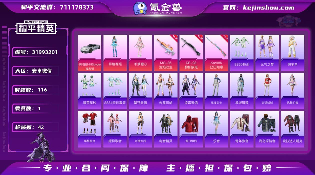 【特价出售】安卓V 可二次 2粉装3粉枪1载具2珍稀飞行器27套装41枪皮 游戏等级23【稀有资产】羊梦糖心 懒羊羊 乐音 【粉色套装】异瞳寒姬 【粉色枪皮】Kar98K-巳巳如意[5级] MG-36-沧焰双生[5级] DP-28-豹影疾电[5级] 【载具】保时捷918 Spyder(液态银) 【飞行器】脆鲨七海飞行器 炫彩糖果飞行器 【珍稀头盔】洛神天依头盔(3级) 荧海星豚头盔(1级) 洛神天依头盔(1级)