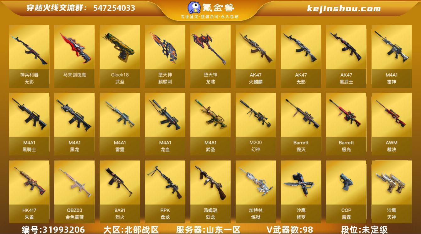 山东一区-102V-2王者武器数-0炫金武器数 【热门武器】:QBZ03-金色蔷薇,HK417-朱雀,M200-幻神,死亡之眼,M4A1-黑骑士,汤姆逊-烈龙*7,RPK-盘龙*6,加特林-炼狱,火麒麟-绝迹,沙鹰-修罗*6 【音效卡】:烈火-动感闪耀 音效卡,AK47-火麒麟音效卡,M4A1-黑骑士音效卡,Barrett-毁灭音效卡 【皮肤】:雷神-暗月,雷神-星空,火麒麟-大唐荣光,火麒麟-心动糖果,毁灭-暗月,毁灭-星空,黑龙-能量核心,黑骑士-暗月,无影-能量核心,极光-能量核心 【角色】:炫,零·纪元,战地猎狐,王者-魅影,堕落女神,乔伊教练,初恋灵狐,芳心审判者,风暴女*2,虎妞,嘉年华灵狐,兰-海滩派对,零-水下丽影,灵狐者-X,潘多拉-X,潜龙队-X,青霞仙子,斯沃特-X,兔囡囡,影武者-X 【人偶武器】:火麒麟-绝迹,巴雷特-零-水下丽影,AWM-灵狐-15周年嘉年华,迷你牛魔王,迷你生化手雷*2,生化手雷-机甲核心*3,深渊终结者手雷,闪光弹-小乔,迷你艾比 【暴走生化】:死亡之眼,超级对讲机 【挑战大师】:冰龙粉碎者-白马银枪*2,VEPR-12-金魔,神圣爆裂者-末日III*2 【英雄级武器】:AK47-火麒麟*2,M4A1-黑龙*2,M4A1-雷神*2,M4A1-黑骑士,AK47-无影*2,AK47-黑武士,M4A1-武圣*2,M4A1-龙血,M4A1-雷霆*2,HK417-朱雀,无影-神兵利器,QBZ03-金色蔷薇,9A91-烈火*2,烈火-动感闪耀,王者之魄-觉醒版,AK47-B-战神,机械迷城-穹宇,Barrett-毁灭*3,Barrett-极光,AWM-裁决,M200-幻神,王者之怒-觉醒版,RPK-盘龙*6,加特林-炼狱,汤姆逊-烈龙*7,沙鹰-修罗*6,沙鹰-天神,COP-雷霆,Glock18-武圣,天神-动感闪耀,屠龙*3,麒麟刺-堕天神,马来剑-夜魔,擎天,唐刀-神工天巧,屠龙-动感闪耀,龙啸-堕天神,高爆手雷-雷霆*7,高爆手雷-堕天神*2,高爆手雷-夜魔,手雷-动感闪耀,闪光弹-雷霆*7,闪光弹-堕天神*