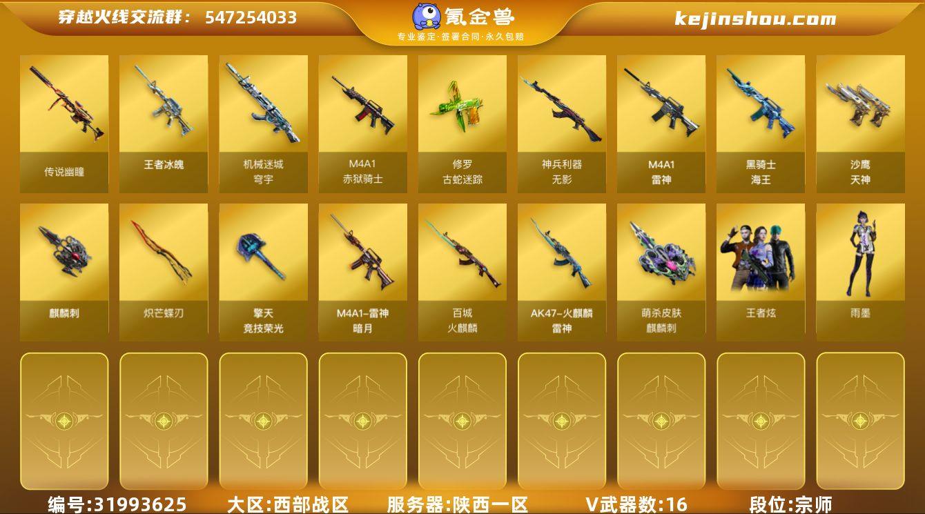 陕西一区-17V-3王者武器数-0炫金武器数 【传说武器】:传说幽瞳 【热门武器】:传说幽瞳,修罗-古蛇迷踪,QBZ03-街机,火麒麟-绝迹,炽芒蝶刃 【王者炫金武器】:王者冰魄,王者之魄高爆手雷,王者之魄闪光弹 【皮肤】:雷神-暗月,雷神-化蛇 皮肤,火麒麟-雷神,火麒麟-百城,麒麟刺-萌杀皮肤 【角色】:雨墨,王者炫,蛇隐宗,暗夜-X,初恋灵狐,芳心审判者,风暴女,嘉年华灵狐,娟娟,猎狐者-追月,0号玩家,灵狐-花神,灵狐者-X,灵狐者-黄金海岸,曼陀罗-X,曼陀罗-礼服,玫瑰花神,萌儿,潘多拉-X,潘多拉-甜心教官,青霞仙子,蛇姬,铁骑荣耀,兔囡囡,维纳斯,雪莉杨,夜玫瑰-宠粉,樱-战斗天使 【人偶武器】:火麒麟-绝迹,AWM-灵狐-15周年嘉年华,夺魂,迷你牛牛,迷你艾比 【挑战大师】:冰龙粉碎者-白马银枪 【英雄级武器】:M4A1-雷神,QBZ03-天罚,无影-神兵利器,黑骑士-海王,机械迷城-穹宇,沙鹰-天神,修罗-古蛇迷踪,麒麟刺,擎天-竞技荣光,炽芒蝶刃,高爆手雷-古蛇迷踪,闪光弹-竞技荣光*3,烟雾弹-竞技荣光,烟雾弹-古蛇迷踪,M4A1-赤狱骑士 【道具】:CFS限定背包,EDG炫彩背包,云山科技背包,古蛇迷踪炫彩背包,背包-洛丽塔,超级背包,迷你冰龙背包,哔哩哔哩名片,女皇终结者-魔龙之吻,绿色巨人,灵魂忍者,迷雾幽灵,夺命之镰,防化服*3,星辰流光-枪王排位,枪王排位28赛季金色流光,枪王排位29赛季金色流光,语音特效-生化,古蛇迷踪打击特效,斯沃特表情,循环实验表情,EP战队名片,EP战队喷图,EP战队击杀图标,C4-沙漠,防弹头盔*7,防弹衣*7,C4工具钳*7,手雷包*7 【特殊枪械】: