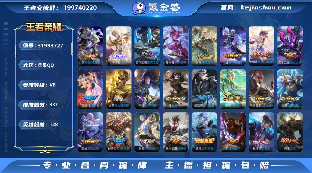 V8 1典藏 1无双 18传说 2星元 333皮肤 128英雄 【1水晶】铠-银白咏叹调【1无双】孙悟空-无相【18传说】达摩-黄金狮子座,貂蝉-猫影幻舞,干将莫邪-久胜战神,宫本武藏-地狱之眼,铠-绛天战甲,李信-一念神魔,孙悟空-零号·赤焰,虞姬-启明星使,赵云-淬星耀世,吕布-怒海麟威,宫本武藏-惊梅引,诸葛亮-鹤羽星尊,夏洛特-浮生妄,孙尚香-乘龙·问璇玑,澜-逐花归海,曜-云鹰飞将,桑启-鸣野蒿,后羿-神树通天【2星元】孙尚香-未来机甲,宫本武藏-幽冥之眼【69史诗】元歌-无心,阿轲-暗夜猫娘,阿轲-节奏热浪,安琪拉-心灵骇客,白起-星夜王子,百里守约-特工魅影,百里玄策-原初追逐者,不知火舞-魅语,蔡文姬-舞动绿茵,曹操-幽灵船长,蔡文姬-繁星吟游,嫦娥-拒霜思,程咬金-功夫厨神,妲己-女仆咖啡,妲己-魅力维加斯,大乔-猫狗日记,狄仁杰-魔术师,狄仁杰-鹰眼统帅,典韦-岱宗,貂蝉-圣诞恋歌,干将莫邪-冰霜恋舞曲,宫本武藏-鬼剑武藏,花木兰-水晶猎龙者,橘右京-修罗,铠-曙光守护者,铠-青龙志,兰陵王-暗隐猎兽者,老夫子-航海奇遇记,李白-千年之狐,李元芳-逐浪之夏,廉颇-地狱岩魂,刘禅-绅士熊喵,露娜-紫霞仙子,鲁班七号-乒乒小将,吕布-圣诞狂欢,吕布-末日机甲,马可波罗-暗影游猎,米莱狄-胡桃异想国,墨子-金属风暴,墨子-龙骑士,娜可露露-晚萤,上官婉儿-梁祝,裴擒虎-李小龙,孙策-猫狗日记,孙尚香-水果甜心,孙尚香-蔷薇恋人,孙尚香-时之恋人,孙悟空-至尊宝,王昭君-偶像歌手,夏侯惇-乘风破浪,项羽-苍穹之光,雅典娜-冰冠公主,杨戬-天秀·启明,嬴政-摇滚巨星,云中君-纤云弄巧,张飞-虎魄,张飞-乱世虎臣,赵云-皇家上将,赵云-引擎之心,甄姬-冰雪圆舞曲,甄姬-游园惊梦,诸葛亮-黄金分割率,沈梦溪-匿光破解者,百里守约-真我赫兹,戈娅-驭风魔法,鲁班七号-蔬乡物语,镜-青焰无极,蒙犽-百解令,蒙恬-荣光圣徽