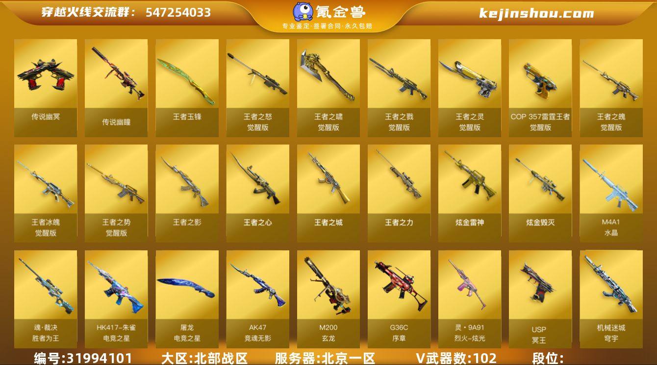 北部战区(北京一区)ys【生化爆破号】三传说【传说艾莉莎,传说幽瞳,传说幽冥】102v【M200-幻神+皮/青鹤,竞技荣光套装,夜魔套装,ScarLight-白虎,QBZ03-金色蔷薇,M4A1-青龙,AWM-裁决,6烈龙+炽芒蝶刃,5黑骑士,USO-冥王,柯尔特-竞技荣光,破空枪刃-夜魔,COP 357-雷霆王者】14王者【王者之城,王者之心,王者之影,王者冰魄,王者之戮,王者之魄,王者之势,王者之力,王者之怒,COP 357-雷霆王者,王者之灵,王者玉峰,王者之啸】2炫金【炫金雷神,炫金毁灭】15角色【四防传说艾莉莎,四防电竞教官-云悠悠,凌霄,葵,迷迭香,晴雅,樱,战地猎狐,幻面灵狐,葵-阿尔法武装,奇洋探员,乔伊教练,蛇隐宗,王者葵-惊若翩鸿,王者涂鸦,炽天使】8音效【QBZ03-金色蔷薇-竞星悦动音效卡,M4A1-黑龙音效卡,M4A1-黑骑士音效卡,AK47-火麒麟音效卡,Barrett-毁灭音效卡,屠龙-电竞之星-竞星跃动音效卡,HK417-朱雀-电竞之星-竞星跃动音效卡,炼狱-百战金芒-庆典舞曲音效卡】30皮【幻神-青鹤,雷神-烈虎,雷神-传奇N9,黑骑士-冠军之势,毁灭-冠军之怒,火麒麟-雷神,火麒麟-心动糖果,雷神-虎将,火麒麟-AG战队】挑战枪【致命乱世-超越MAX】【vip6】截图展示段位不代表实际段位 如赛季更新等不可抗拒因素发生变化、时限道具不保证所剩时间