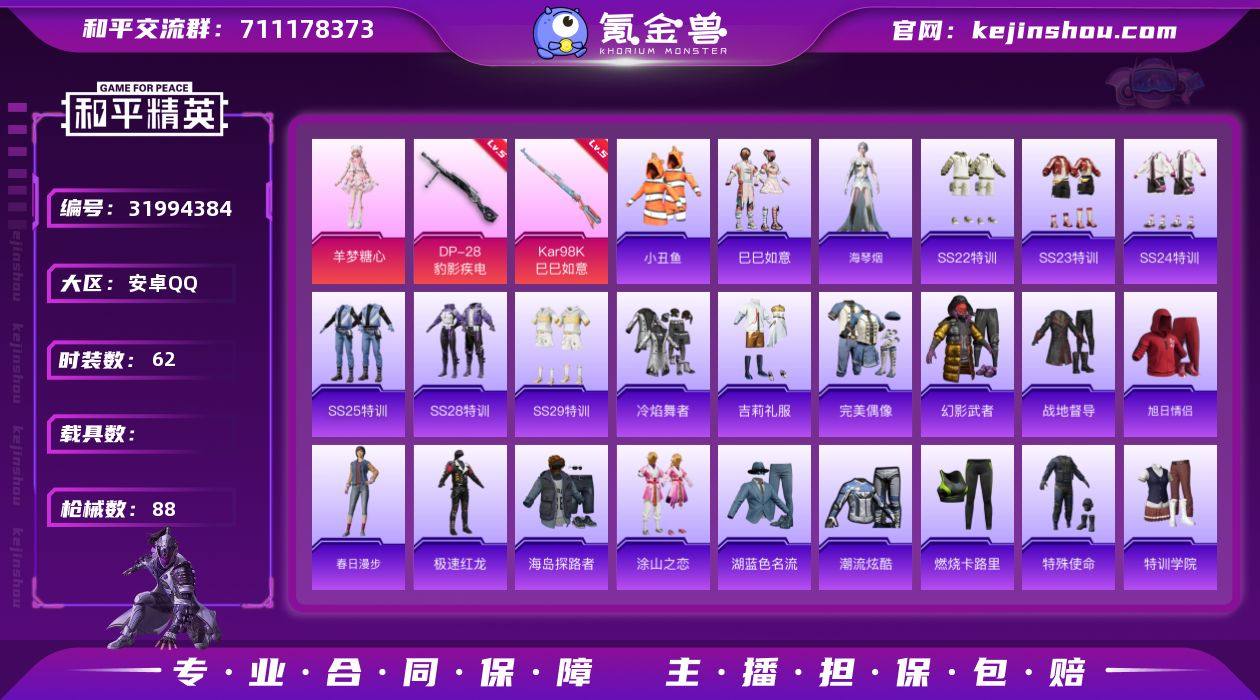无二次安卓 手Q-1粉装-3特效枪-0载具-1粉色飞行器-21920热力值-1王牌印记-62套装-88枪皮TD26335 【热门品类】:套装-小丑鱼 【粉色套装】:角色-羊梦糖心 【粉色枪皮等级】:Kar98K-巳巳如意(五级),Mk14-福马献瑞(一级),DP-28-豹影疾电(五级) 【粉色枪皮】:Kar98K-巳巳如意,Mk14-福马献瑞,DP-28-豹影疾电 【粉色飞行器】:炫彩糖果飞行器 【粉色降落伞】:洛神天依降落伞,青空秋雨降落伞,炫彩糖果降落伞,虹云熊熊降落伞 【稀有套装】:套装-巳巳如意,套装-马上有钱,角色-海琴烟 【稀有枪皮】:AKM-彩虹符号,AKM-破晓战魂,AKM-龙的传人,SCAR-L-夜灯,SCAR-L-红色方程式,M416-蓝色火焰,GROZA-彩虹符号,AUG-天降萌叽,AUG-耀粉歌者,QBZ-彩虹符号,AC-VAL-天降萌叽,蜜獾-天降萌叽,UZI-啾咪啾咪,UZI-天降萌叽,UZI-红色方程式,UZI-月影灵韵,UMP45-夜灯,UMP45-涂山之恋,汤姆逊-暗夜鎏金,汤姆逊-耀粉歌者,P90-巳巳如意,Kar98K-彩虹符号,Kar98K-影袭,SKS-炫彩节奏,Mini14-涂山之恋,Mini14-耀粉歌者,SLR-彩虹符号,M417-虹云熊熊,S686-红色方程式,S686-千金淑猫,S12K-玩趣呆呆,S12K-破晓战魂,S12K-夜灯,DP-28-彩虹符号,MG3-幻世战舞者,R45-幻彩电音 【其他套装】:套装-SS22特训,套装-SS23特训,套装-SS24特训,套装-SS25特训,套装-SS28特训,套装-SS29特训,套装-冷焰舞者,套装-吉莉礼服,套装-完美偶像,套装-幻影武者,套装-战地督导,套装-旭日情侣,套装-春日漫步,套装-极速红龙,套装-海岛探路者,套装-涂山之恋,套装-湖蓝色名流,套装-潮流炫酷,套装-燃烧卡路里,套装-特殊使命,套装-特训学院,套装-猎鹰,套装-猛禽,套装-王牌教练,套装-甜蜜告白,套装-白色伏地魔,套装-破蛋小黄鸡,套装-竞技名士,套装-红色运动,套装-绮丽涂鸦,套装-缤纷果语,套装-耀粉歌者...