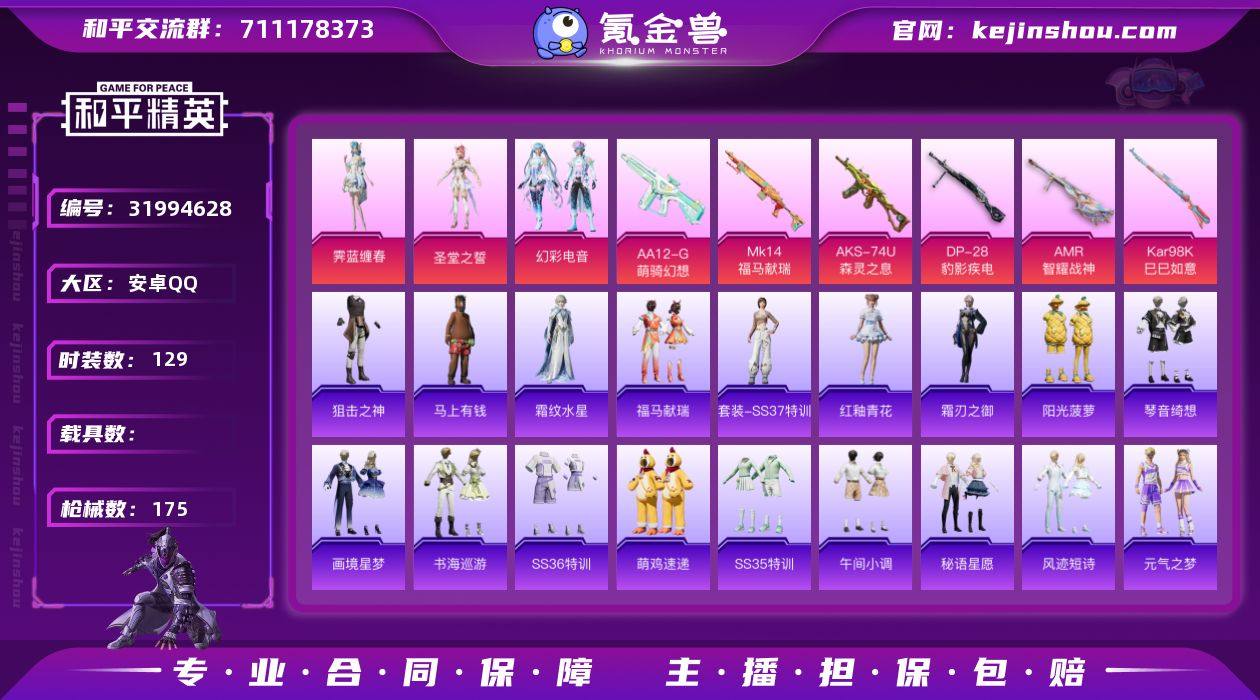 【0载具 6特效枪 3粉装 175枪皮 129套装】女号,妹子号/8印记/5万热力值/56级收藏家/有美羊羊,懒羊羊,螃蟹头/角色-圣堂之誓,角色-霁蓝缠春,套装-幻彩电音/6升级枪:AMR-智耀战神,Kar98K-巳巳如意,Mk14-福马献瑞,AKS-74U-森灵之息,AA12-G-萌骑幻想,DP-28-豹影疾电/7飞行器:鸡智如我飞行器,登顶巅峰飞行器,辉光之愿飞行器,马上有福飞行器,狂鲨锋刃飞行器,炫彩糖果飞行器,异域银装飞行器190783427x,编号:LYRGC57