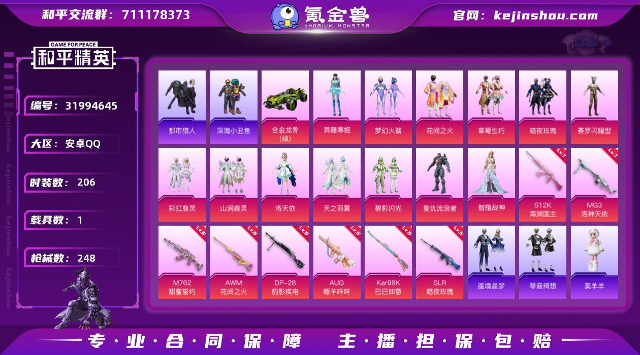 【ky26】安卓 手Q-14粉装-18特效枪-1载具-2粉色飞行器-81357热力值-14王牌印记-170套装-259枪皮 【热门品类】:套装-浪漫天命,套装-深海小丑鱼,角色-军刀雅典娜,套装-动感兔斯基人偶服,角色-2B战斗服款,角色-忠义严颜,套装-龟仙人,角色-8号机,角色-Mark.06,大砍刀-青龙偃月刀 【粉色套装】:粉装-金曜白虎,粉装-花间之火,粉装-冰霜白皇,粉装-炙焰红王,角色-洛天依,粉装-吟月归客,角色-初号机款机体服,角色-复仇流浪者,粉装-第五大道,玩偶服-猪猪侠,角色-狂花道·不知火舞,角色-羲和光序,角色-智耀战神,角色-羊梦糖心 【粉色枪皮等级】:AKM-绿萝繁花(五级),SCAR-L-锦绣绵绵(五级),M416-风花雪月(六级),M416-电玩时刻(二级),GROZA-镜光银凌(五级),AUG-暖羊咩咩(五级),AUG-圣斗士星矢(七级),M762-青锋波束(五级),Famas-初号机 觉醒Ver.(五级),UMP45-量子极限(五级),AKS-74U-森灵之息(五级),Kar98K-巳巳如意(五级),AWM-天使羽翼(五级),M417-第五大道(四级),DP-28-暗夜鎏金(五级),DP-28-豹影疾电(五级),MG3-洛神天依(五级) 【粉色载具】:宝马M4(圣保罗黄) 【粉色枪皮】:AKM-绿萝繁花,SCAR-L-锦绣绵绵,M416-风花雪月,M416-电玩时刻,GROZA-镜光银凌,AUG-暖羊咩咩,AUG-圣斗士星矢,M762-青锋波束,Famas-初号机 觉醒Ver.,UMP45-量子极限,AKS-74U-森灵之息,Kar98K-巳巳如意,AWM-天使羽翼,Mk14-闲梦青缨,M417-第五大道,DP-28-暗夜鎏金,DP-28-豹影疾电,MG3-洛神天依 【粉色飞行器】:繁龙极客飞行器 【粉色降落伞】:幻影战神降落伞,花间之火降落伞,童趣迷兔降落伞,星之彼岸降落伞,洛神天依降落伞,环太平洋降落伞,灵感创作师降落伞,青空秋雨降落伞,暗夜鎏金降落伞,音爆索尼克降落伞,第五大道降落伞,仲夏莫吉托降落伞,飒粉甜心降落伞,蜜语绒猫降落伞,...