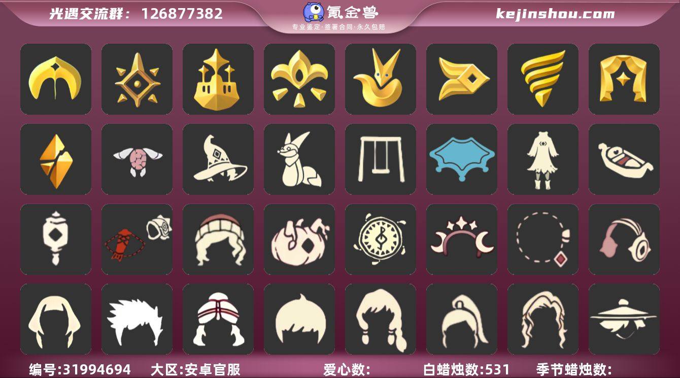 账号类型: 手机账号 季节已毕业: 圣岛季,预言季,梦想季,小王子季,风行季,潜海季,表演季,破晓季,欧若拉季,集结季,夜行季,追忆季,拾光季,归巢季,九色鹿季,筑巢季,二重奏季,姆明季,彩染季,青鸟季 完成地图: 晨岛,云野,雨林,霞谷,暮土,禁阁 珍稀物品: 鳐鲲斗篷,阿努比斯(狗头),白枭,透明蝶翼斗,玫瑰花,彩虹围巾 礼包: 蝙蝠套,巫师,围巾,欧若拉之翼,绊爱,大铁头,鹿角,蜘蛛斗,秋千,茶桌,茶壶,白绒金,瑞雪,女巫裙,福娃,跷跷板,小船,灯笼,致爱装扮,人声乐器,奔跑发型,彩虹帽,雪花球,绒帽,橘子,贝壳,红伞,兔子,南瓜,枯角,雪花,水母,猫套,猫背饰,星月头饰,彩虹耳钉,彩虹耳机,新年裤,蝴蝶结,魔法棒,四叶草,创始人,蛛网朋克,海龟斗篷,奉献斗篷 裤子: 武士裤,背带裤,搓澡巾,击剑裤,妮妮裙子,王子服,蓝绿裤,飞天裤,筑巢季·裤子,青鸟尊贵蓬头裤子 面具: 阿努比斯,凤凰面具,贴花面具,呼吸面具,夜行毕业面具,黄眉企鹅面具,辉光羚羊面具 面饰: 红耳机,黑框眼镜,青鸟毕业面饰 项链: 围巾 发型: 归巢毕业发型,若笠,虚荣,单侧绑发,小王子发型,留辫蘑菇头,飞天盘发 头饰: 行军锅头盔,羽毛发饰,牛仔帽,蓝色音乐会,平顶帽 斗篷: 海洋斗,蟑螂斗,绿芽,粉红绒毛斗篷,遥鲲斗篷,黄色连帽披风,燕尾斗篷,冥龙斗篷,彩染围巾斗篷,奉献斗篷,青鸟毕业斗篷 配饰: 雨伞,筑巢季·小手办,高音钢琴,姆明抱枕,小红伞,相机,玫瑰花,二重奏挂画,圆鼓,蓝色手碟,鲲灯 亮点: 【优质装备】:预言季,阿努比斯(狗头),表演季,白枭(帝企鹅发),武士裤,圣岛季,梦想季,小王子季(王子季),风行季,潜海季,破晓季,鳐鲲斗篷,透明蝶翼斗,欧若拉季(欧若拉),归巢毕业发型(五塑彩羽发),行军锅头盔(六边锅帽子)(双耳锅帽子),羽毛发饰(多羽发饰),筑巢季·小手办(光之子试衣),高音钢琴(白色高脚钢琴),集结季,玫瑰花,夜行季,追忆季,妮妮裙子(妮妮长裙),牛仔帽(西部帽),姆明抱枕,小红伞(姆...
