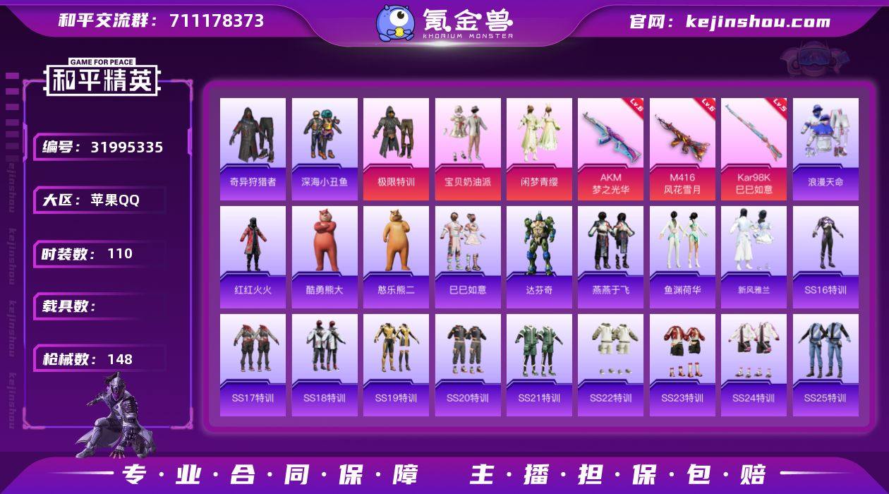 无二次苹果 手Q-3粉装-5特效枪-0载具-0粉色飞行器-46424热力值-7王牌印记-110套装-148枪皮TD263311 【热门品类】:套装-浪漫天命,套装-深海小丑鱼,套装-奇异狩猎者,套装-红红火火 【粉色套装】:粉装-极限特训,粉装-宝贝奶油派,粉装-闲梦青缨 【粉色枪皮等级】:AKM-梦之光华(六级),M416-风花雪月(六级),UMP45-萌骑冒险(四级),Kar98K-巳巳如意(五级),Mk14-福马献瑞(五级) 【粉色枪皮】:AKM-梦之光华,M416-风花雪月,UMP45-萌骑冒险,Kar98K-巳巳如意,Mk14-福马献瑞 【粉色降落伞】:梦幻火箭降落伞,碧影闪光降落伞,恐龙拽拽降落伞,筑梦精灵降落伞,垂柳戏鸭降落伞,精灵梦叶罗丽降落伞 【稀有套装】:玩偶服-酷勇熊大,玩偶服-憨乐熊二,套装-巳巳如意,角色-达芬奇,套装-燕燕于飞,套装-鱼渊荷华,套装-新风雅兰 【稀有枪皮】:AKM-奇异狩猎者,AKM-彩虹符号,AKM-灼热熔岩,AKM-生命誓言,AKM-筑梦精灵,AKM-缤纷海域,AKM-虎虎生威,AKM-龙的传人,M16A4-幻世战舞者,M16A4-甜心亚梦,SCAR-L-炫彩节奏,SCAR-L-玉兔迎春,SCAR-L-红色方程式,SCAR-L-黄金龙骨,M416-糯团青竹,M416-红色方程式,GROZA-异彩先驱,AUG-耀粉歌者,QBZ-彩虹符号,QBZ-飞驰魅影,M762-天降萌叽,M762-奇异狩猎者,M762-彩虹符号,M762-瑞龙福将,Mk47-炫光之旅,AC-VAL-天降萌叽,AC-VAL-甜心亚梦,蜜獾-垂柳戏鸭,蜜獾-天降萌叽,蜜獾-娇憨猪猪,UZI-啾咪啾咪,UZI-娇憨猪猪,UZI-炫彩节奏,UMP45-涂山之恋,UMP45-猪猪侠,UMP45-蓝色火焰,Vector-焰鹰斗篷,Vector-彩虹符号,汤姆逊-奇异狩猎者,汤姆逊-异彩先驱,汤姆逊-炫彩节奏,MP5K-异彩先驱,P90-飞驰魅影,P90-巳巳如意,Kar98K-梦幻火箭,Kar98K-炫彩节奏,Kar98K-飞驰魅影,M24-奇异狩猎者,AWM-焰鹰斗篷,AWM-垂柳戏鸭,AWM-炙焰牛王,AWM-黄金龙骨,SK...