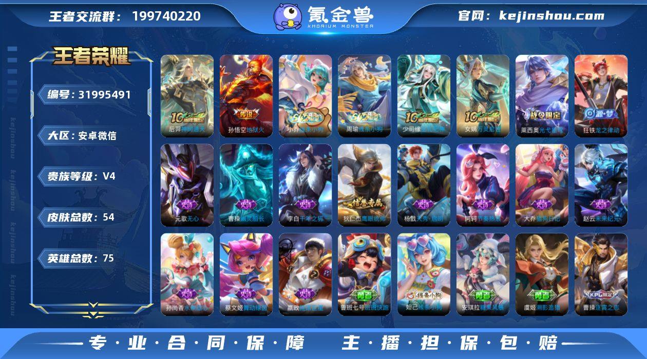 安卓V-有二次-V4(2012分)-54皮-2传说-861场-【最新段位以实际为准,截图仅供参考】 【英雄全皮】:孙权全皮 【传说皮肤】:后羿神树通天,孙悟空地狱火 【限定皮肤】:狄仁杰阴阳师,元歌无心,项羽海滩派对,沈梦溪龙舞盛年 【赛季限定】:钟馗虚灵犬护,亚瑟荣光之誓 【战令限定】:莱西奥光弋星穹,明世隐往忆晖光,周瑜线条小狗,小乔线条小狗 【史诗皮肤】:周瑜线条小狗,小乔线条小狗,少司缘巫礼祀神,女娲万灵启世,莱西奥光弋星穹,狂铁龙之律动,元歌无心,杨戬天秀启明,狄仁杰鹰眼统帅,大乔猫狗日记,阿轲节奏热浪,蔡文姬舞动绿茵,李白千年之狐,曹操幽灵船长,嬴政摇滚巨星,孙尚香水果甜心,赵云未来纪元 【其他皮肤】:鲁班七号班班快跑,妲己线条小狗,安琪拉糖果风暴,虞姬溯影追猎,曹操逐霄之志,艾琳鹤鸣心笺,孙权径山谋武,明世隐往忆晖光,亚瑟荣光之誓,白起死霸装,姬小满小满鸭,露娜命运加冕,阿古朵布丁狗之约,张良灵野札记,钟馗虚灵犬护,沈梦溪龙舞盛年,李白敏锐之力,王昭君幻想奇妙夜,狄仁杰阴阳师,后羿阿尔法小队,花木兰兔女郎,孙膑天使之翼,白起白色死神,露娜哥特玫瑰,项羽海滩派对,澜孤猎,曜归虚梦演,嫦娥露花倒影,公孙离花间舞,女娲尼罗河女神,百里玄策威尼斯狂欢,铠龙域领主,黄忠芝加哥教父,太乙真人圆桌骑士,马可波罗激情绿茵 【营地ID】:1634405851