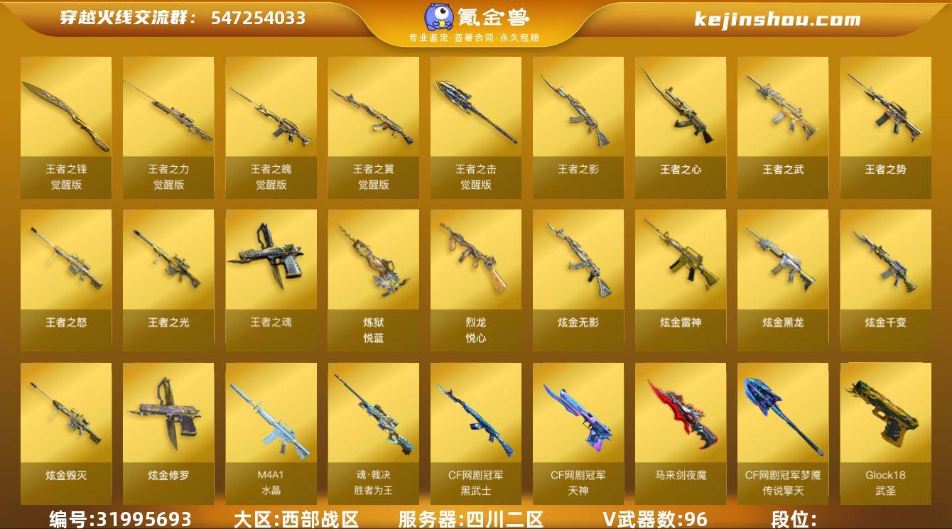 西部战区(四川二区)96v【M200-竞技荣光,武圣套装,QBZ03-金色蔷薇,Barrett-毁灭套装+皮/星空,6烈龙+5修罗+死亡之眼,金刚伞】15王者【王者之心,王者之翼,王者之影,王者之魄,王者之武,王者之势,王者之光,王者之力,王者之怒,王者之魂,王者之锋,王者之击】6炫金【炫金无影,炫金黑龙,炫金雷神,炫金千变,炫金毁灭,炫金修罗】6角色【审判者,葵,堕落女神,樱,王者之瞳,乔伊教练】1音效【Barrett-毁灭音效卡】52皮【毁灭-星空,雷神-星空,修罗-星空,雷神-耀金,毁灭-AG-CFPLS15冠军,火麒麟-传奇EVEN,天龙-传奇白鲨,雷神-荣耀之魄,火麒麟-AG战队,火麒麟-CF STAR,修罗-CF STAR,死神-秘银,天龙-秘银,屠龙-荣耀之锋】截图展示段位不代表实际段位 如赛季更新等不可抗拒因素发生变化、时限道具不保证所剩时间
