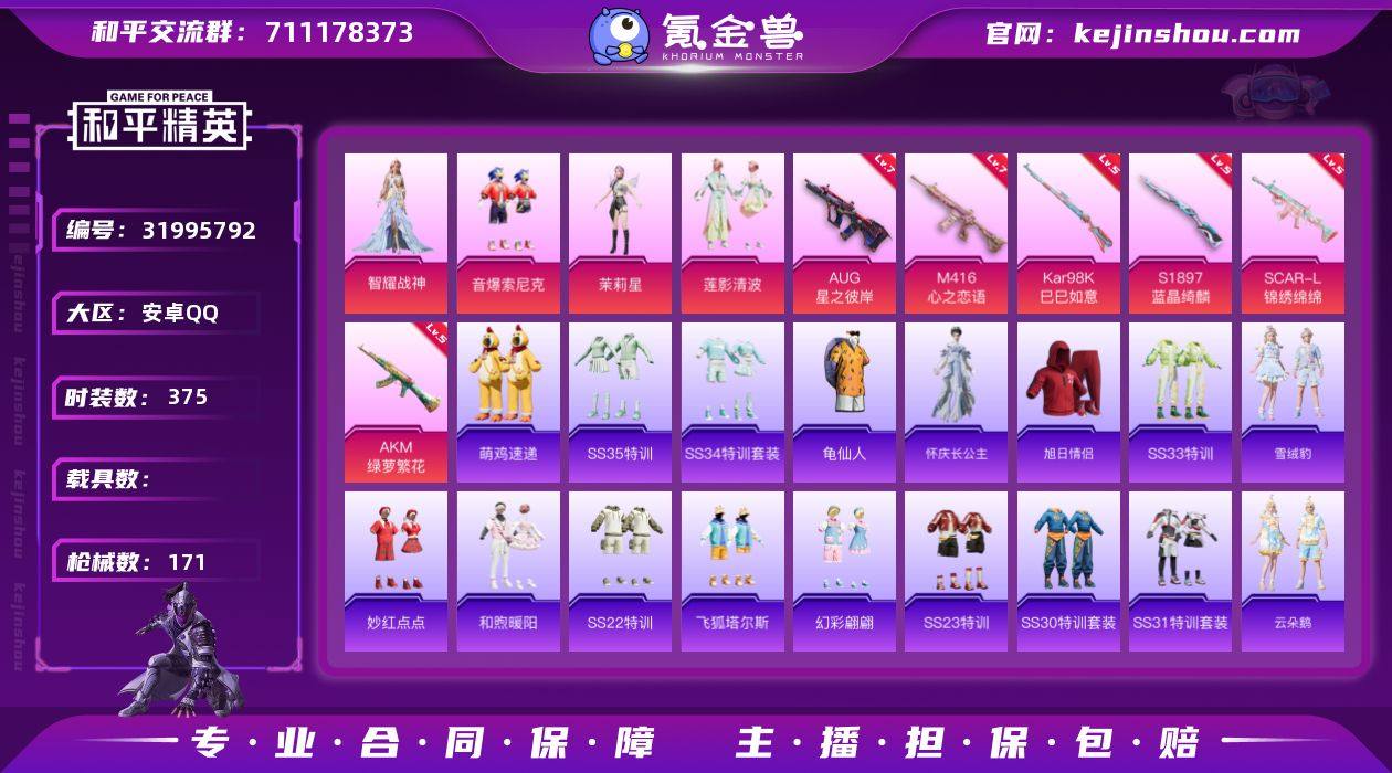 0载具-106套装-171枪皮-安卓手Q-/可二次实名/12王牌印记-4粉装-6特效枪-51439热力值-106套装-171枪皮【4粉装】角色-茉莉星,套装-莲影清波,套装-音爆索尼克,角色-智耀战神【6特效枪】AKM-绿萝繁花/5级,Kar98K-巳巳如意/5级,S1897-蓝晶绮麟/5级,M416-心之恋语/7级,SCAR-L-锦绣绵绵/5级,AUG-星之彼岸/7级【2稀有紫装】龟仙人,怀庆长公主【106稀有时装】智耀战神,SS35特训,SS31特训,SS33特训,SS32特训,白辉玉蕊,蓝冰羽,雪绒豹,恋语绒绒,SS34特训,紫幽梦,大橘大利,绛羽幽主,龟仙人,怀庆长公主,萌鸡速递,粉恋花,云朵鹅,茉莉星,莲影清波,音爆索尼克,鱼渊荷华,SS30特训,青团波波,燕燕于飞,战术大师,智谋强哥,糖糖葫芦,巳巳如意,焰鹰斗篷,雪兔飞飞,夏日音浪,龙的传人,军刀雅典娜,萌黄之夏,飞驰魅影,音速流光,涂山之恋,SS26特训,沙漠雄狮,空岛之星,炫蓝之夏,竞技名士,长空猛禽,特战装甲,旭日情侣,甜蜜告白,冷焰舞者,惊鸿侠骨,魅力单车,春光漫游,甜心亚梦,虚音幻奏,极地朋克,幻世战舞者,特殊使命,牛气满满,萌趣咩咩,娇憨猪猪,春日漫步,冰川特警,龙腾端午,麻辣教官,破蛋小黄鸡,快闪甜心,淡雅花蕊,野性战心,玲珑飞花,和煦暖阳,田园牧歌,轻风白浪,探宝勇士,SS12特训,SS27特训,牛气冲天,SS18特训,银白舞王,熠彩粉晶,金戈铁马,SS19特训,光之冒险,SS20特训,SS21特训,玉兔迎春,SS22特训,SS23特训,冰爽海盐,飞狐塔尔斯,SS14特训,神气柴柴,妙红点点,幻彩翩翩,格斗先锋,幻羽潜行,海盐绵绵冰,老实芭蕉,王牌教练,荣耀,柠萌假日,SS24特训,鹤鸣,懵萌河马,SS25特训,快乐星愿,锦衣飞扬,星梦畅游 【171稀有枪械】M416-心之恋语/7级,S1897-精灵梦叶罗丽,SCAR-L-海盐豹豹,Kar98K-巳巳如意/5级,S1897-蓝晶绮麟/5级,Mk14-冰河战士,AKM-绿萝繁花/5级,SCAR-L-锦绣绵绵/5级,AUG-星之彼岸/7级,Win94-乌木金纹,PKM-紫幽梦,MG3-霓彩脉冲,Mk14-紫幽梦,蜜獾...
