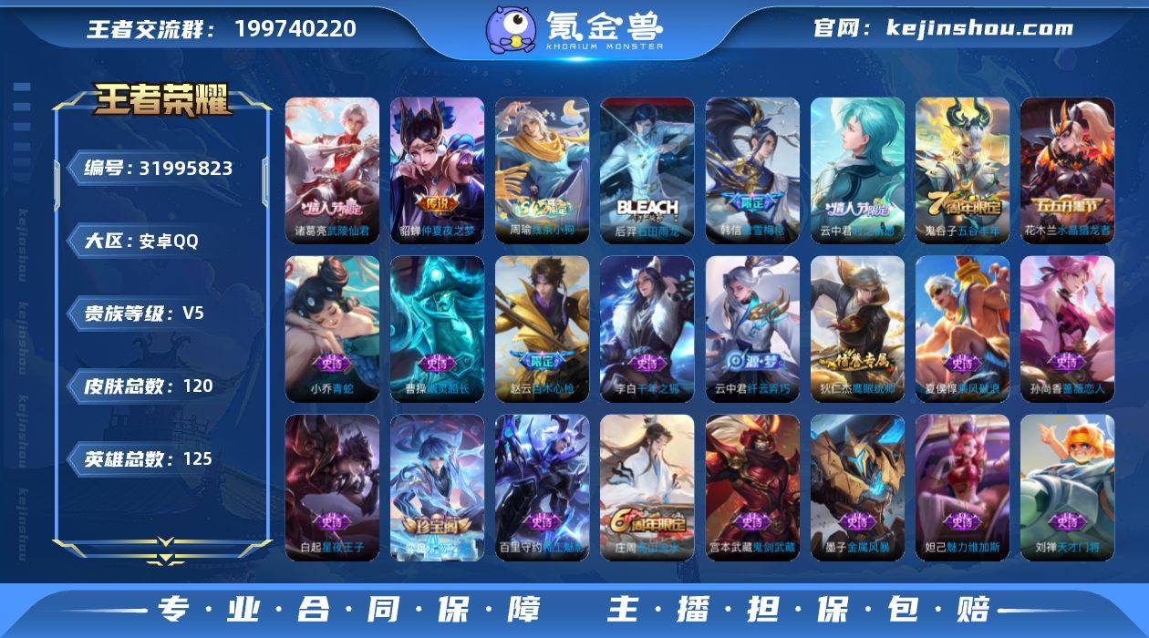 安卓Q-V5-永恒钻石III段位-123英雄-105皮肤-2传说-18史诗 【传说皮肤】:诸葛亮武陵仙君,貂蝉仲夏夜之梦 【限定皮肤】:狄仁杰阴阳师,赵云皇家上将,赵云百木心枪,孙尚香蔷薇恋人,庄周高山流水,狄仁杰万华元夜,达摩沙漠行僧,项羽海滩派对,老夫子醍醐杖,程咬金演武夺筹,韩信傲雪梅枪,兰陵王金庭之子,李元芳云中旅人,钟馗驱傩正仪,鬼谷子原初探秘者,鬼谷子五谷丰年,诸葛亮武陵仙君,苏烈千军破阵,沈梦溪大漠名商,明世隐疑决卦,裴擒虎擒涛扼浪,云中君纤云弄巧,云中君时之祈愿,鲁班大师探海日志,桑启海盐诗旅,鬼谷子天穹祈灯 【赛季限定】:狄仁杰万华元夜,达摩沙漠行僧,老夫子醍醐杖,程咬金演武夺筹,兰陵王金庭之子,李元芳云中旅人,钟馗驱傩正仪,鬼谷子原初探秘者,苏烈千军破阵,沈梦溪大漠名商,明世隐疑决卦,裴擒虎擒涛扼浪,鲁班大师探海日志,桑启海盐诗旅,鬼谷子天穹祈灯 【史诗皮肤】:赵云皇家上将,宫本武藏鬼剑武藏,孙尚香蔷薇恋人,妲己魅力维加斯,墨子金属风暴,花木兰水晶猎龙者,刘禅天才门将,白起星夜王子,狄仁杰鹰眼统帅,小乔青蛇,云中君纤云弄巧,庄周高山流水,韩信傲雪梅枪,云中君时之祈愿,赵云百木心枪,鬼谷子五谷丰年,弈星万物之道,后羿石田雨龙 【其他皮肤】:项羽海滩派对,韩信教廷特使,韩信街头霸王,露娜哥特玫瑰,赵云白执事,赵云忍炎影,牛魔西部大镖客,宫本武藏未来纪元,姜子牙时尚教父,典韦黄金武士,亚瑟死亡骑士,达摩拳王,花木兰兔女郎,甄姬花好人间,宫本武藏万象初新,狄仁杰阴阳师,刘备纽约教父,墨子进击墨子号,钟无艳海滩丽影,孙尚香沉稳之力,诸葛亮掌控之力,苏烈坚韧之力,吕布野性能量,沈梦溪鲨炮海盗猫,哪吒次元突破,明世隐疑决卦,老夫子醍醐杖,鬼谷子原初探秘者,狄仁杰万华元夜,程咬金演武夺筹,张...