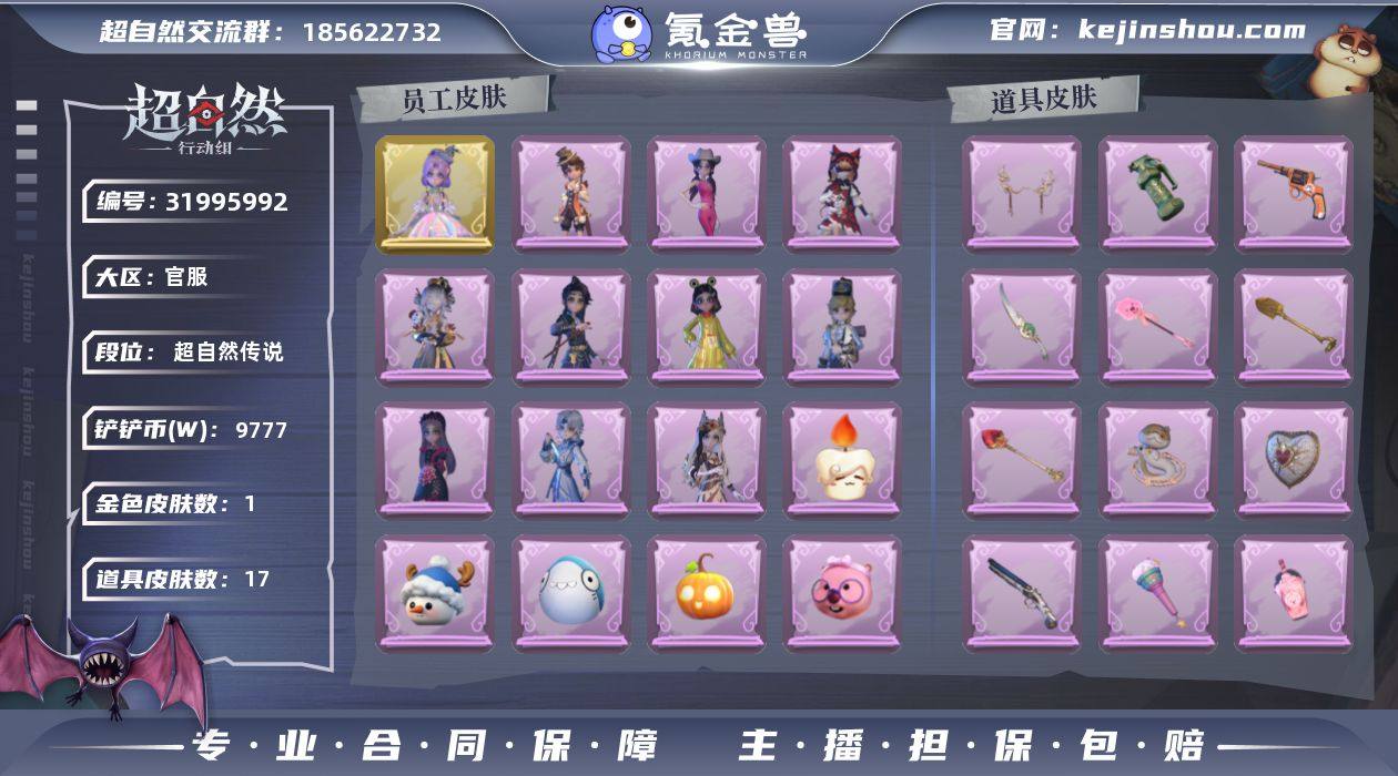 金皮1;紫皮10;道具皮17;皮肤:小黄-遗失的童话,阿念-王子与骑士,莉莉-除妖小师妹,薇薇安-白光莹,零-青云逸歌,爱丽丝-耀眼的你,莉莉-莓果陷阱,小黄-呱呱雨衣,阿念-庆宴绮愿,逍遥-绣春逍影,爱丽丝-丝缕哀歌;道具:夜视仪-心跳眼镜,转轮手枪-新星时代,闪光弹-金戈玄铜,夜视仪-敛花容,黄牛能量饮料-珍珠芭乐莓莓,专业手电-云端梦想计划,腰包-宝剑八,音响-鸣沙鼓,刺刀-碧络琅环,短管猎枪-星光的裁决,长鞭-新春炸响,专业手电-花束般的告白,铲子-赞萌波板糖,铲子-圣心之泪,急救包-蔷薇物语,铲子-龙鳞,长鞭-小狗蛇点点鞭;饰品:头饰-小财神豚豚头套,头饰-大葱明头套,头饰-卑微头套,头饰-雪墩墩头套,头饰-火爆了头套,头饰-小狗蛇点点头套,头饰-炙热烧烤,头饰-鱼头怪头套,头饰-蒜了八,头饰-惊魂南瓜头套,头饰-萨卡班甲鱼头套,头饰-嘻嘻头套,头饰-烛光纪念,头饰-呆滞头套,头饰-精致露比头套,头饰-哈士奇头套,头饰-面具马头套,头饰-烈焰红唇头套,头饰-马上有钱,头饰-太空鲨头套,头饰-滑稽头套,头饰-像素朋克墨镜,头饰-后室幸存者头套,挂饰-糖果守卫,挂饰-九色祥鹿,挂饰-拂云仙,挂饰-未竟乐园,挂饰-钗头凤,背饰-蝶恋花,背饰-绒团小狐狸,背饰-牛啤背包;动作:动作-luvaboy,动作-鸳鸯戏,动作-舞台中心,动作-新年摇,动作-知世摇,动作-金城舞,动作-刀马舞,动作-鹏友摇,动作-九万字舞,动作-举牌,动作-律动迪斯科,动作-抬手,动作-带你逃跑吧,动作-拜年,动作-要糖,动作-KT猫摇;工牌背景:工牌背景-卷珠帘,工牌背景-复活的肖像,工牌背景-蓝海奇遇,工牌背景-圣光之誓,工牌背景-佛系小豚,工牌背景-点点萌伴,工牌背景-心同野鹤,工牌背景-情语塔;工牌动作:工牌动作-净禅,工牌动作-轻躯鹤立,工牌动作-虔诚之姿;员工:逍遥,爱德华,零,爱丽丝,小黄,阿念,艾伦,莉莉,兰,薇薇安,巫铃儿;累充1056元;铲铲币977.7万;金砖12;段位:超自...