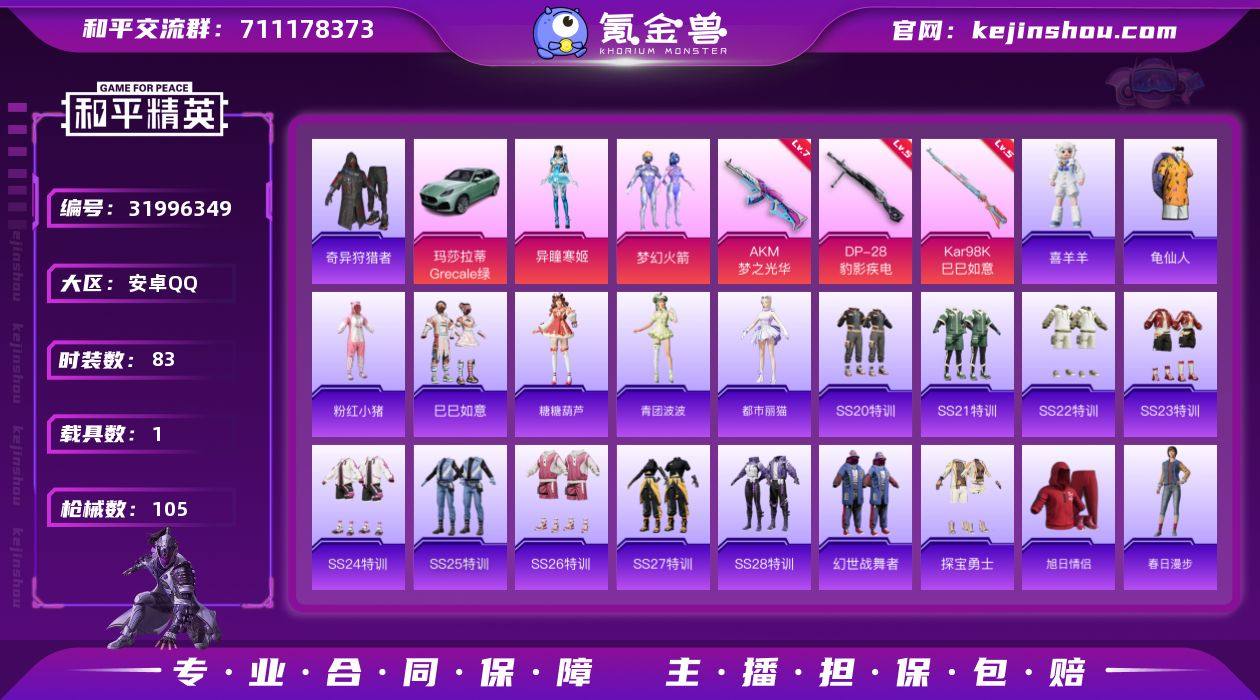 LK263113 安卓 手Q-2粉装-3特效枪-1载具-1粉色飞行器-32772热力值-7王牌印记-83套装-105枪皮 【热门品类】:粉装-梦幻火箭,套装-奇异狩猎者,套装-龟仙人,套装-粉红小猪 【粉色套装】:粉装-梦幻火箭,角色-异瞳寒姬 【粉色枪皮等级】:AKM-梦之光华(七级),Kar98K-巳巳如意(五级),DP-28-豹影疾电(五级) 【粉色载具】:玛莎拉蒂Grecale(薄荷绿) 【粉色枪皮】:AKM-梦之光华,Kar98K-巳巳如意,DP-28-豹影疾电 【粉色飞行器】:梦幻火箭飞行器 【粉色降落伞】:相思残雪降落伞,垂柳戏鸭降落伞,第五大道降落伞,临安公主降落伞,异瞳寒姬降落伞,罪夜之冕降落伞 【稀有套装】:套装-龟仙人,套装-巳巳如意,套装-糖糖葫芦,套装-青团波波,角色-都市丽猫,玩偶服-喜羊羊 【稀有枪皮】:AKM-破晓战魂,AKM-龙的传人,M16A4-幻世战舞者,M16A4-甜心亚梦,SCAR-L-炫彩节奏,SCAR-L-玉兔迎春,SCAR-L-红色方程式,M416-糯团青竹,M416-红色方程式,M416-蓝色火焰,AUG-天降萌叽,AUG-耀粉歌者,QBZ-彩虹符号,M762-天降萌叽,M762-奇异狩猎者,M762-彩虹符号,Mk47-妙红点点,AC-VAL-天降萌叽,AC-VAL-快闪甜心,AC-VAL-甜心亚梦,蜜獾-天降萌叽,蜜獾-娇憨猪猪,UZI-啾咪啾咪,UZI-娇憨猪猪,UMP45-绒宝小鹅,汤姆逊-幻影战神,P90-快闪甜心,P90-巳巳如意,M24-奇异狩猎者,SKS-心之恋语,SKS-炫彩节奏,Mini14-旋转彩虹,Mini14-耀粉歌者,Mini14-绯穹魔姬,SLR-娇憨猪猪,莫辛纳甘-炙焰牛王,AMR-妙红点点,MK20-H-快闪甜心,S686-红色方程式,S1897-炫彩节奏,S12K-娇憨猪猪,S12K-幻世战舞者,DBS-圣堂之誓,DBS-甜心亚梦,M249-妙红点点,M249-彩虹符号,M249-糯团青竹,DP-28-彩虹符号,DP-28-旋转彩虹,DP-28-甜心亚梦,MG3-妙红点点,MG3-幻世战舞者,短管霰弹-竹节火铳,沙漠之鹰-快闪甜心,大砍刀-...