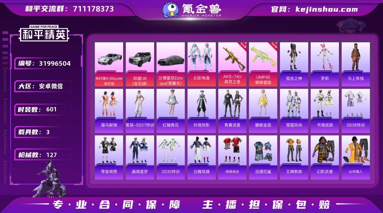 实名:可二次实名 是否支持人脸包赔:支持 粉装数量:1 特效枪数量:2 载具数:3 时装数:601 枪械数:127 幻彩电音 五级AKS-74U-森灵之息,四级UMP45-萌骑冒险 保时捷918Spyder(液态银),兰博基尼Estoque(银翼灰),仰望U8(龙石绿) 狙击之神,罗莉,马上有钱,福马献瑞,红釉青花,SS37特训,雨过天青,玲珑侠影,青翼流星,馥郁金蕊,雪国风尚,画境星梦,琴音绮想,书海巡游,SS36特训,SS35特训,云魄琉璃,北国孤狼,滨海厨神,滨海假日,白糯汤圆,白色伏地魔,白熊同盟,长空猛禽,丛林猎人,潮流先锋,潮流炫酷,传奇侦探,春日漫步,登山爱好者,都市魅力,绯格组合,疯狂小兔子,风行保卫者,福星高照,飞行日记,刚毅裁决者,光之冒险,海滨突袭者,湖蓝色名流,黑色伏地魔,黄色伏地魔,灰色格斗者,黄色名流,黄色运动,红色运动,幻世战舞者,黑夜传说,幻影武者,酒红色名流,惊鸿侠骨,橘黑制服,竞技达人朋克,竞技名士,竞技勇士朋克,吉莉礼服,坚韧舞者,极速光影,极速红龙,决胜时刻,街头潮人,街头风暴,锦衣飞扬,科技之星,空投萌叽,蓝彩潮人,猎鹰,浪漫假日,蓝色运动,冷焰舞者,漫步者,猛禽,魅力单车,萌趣颜团子,萌熊伴侣,霓虹街区,怒火燎原,霓虹热舞,柠萌假日,牛气满满,破蛋小黄鸡,破晓战魂,青春校园,绮丽涂鸦,青年教官,青涩时光,骑行爱好者,青玉碎影,荣耀,热情海星,人气偶像,燃烧卡路里,热血青春,S5赛事,S6赛事,圣诞大吉,闪电轻猫,深海格斗者,深蓝色名流,沙漠兵团,SS10特训,SS12特训,SS13特训,SS14特训,SS15特训,SS17特训,SS18特训,SS19特训,SS20特训,SS21特训,SS22特训,SS25特训,SS28特训,SS2特训,SS31特训套装,SS3特训,SS5特训,SS6特训,SS7特训,SS9特训,探宝勇士,甜蜜告白,特训学院,突袭者,完美偶像,王牌教练,迅捷狂鲨,旭日情侣,夏日音浪,雪山精英,香桃花海,迎春赐吉,耀粉歌者,野性战魂,鹰眼刺客,夜莺强袭者,战地督导,战地名士,战地菁英,灼焰舞者,治愈之星 阿狸红降落伞,暗星紫秘降落伞,幻彩电音降落伞,精灵梦叶罗丽降落伞 卖家说:一切正常可改九年老号