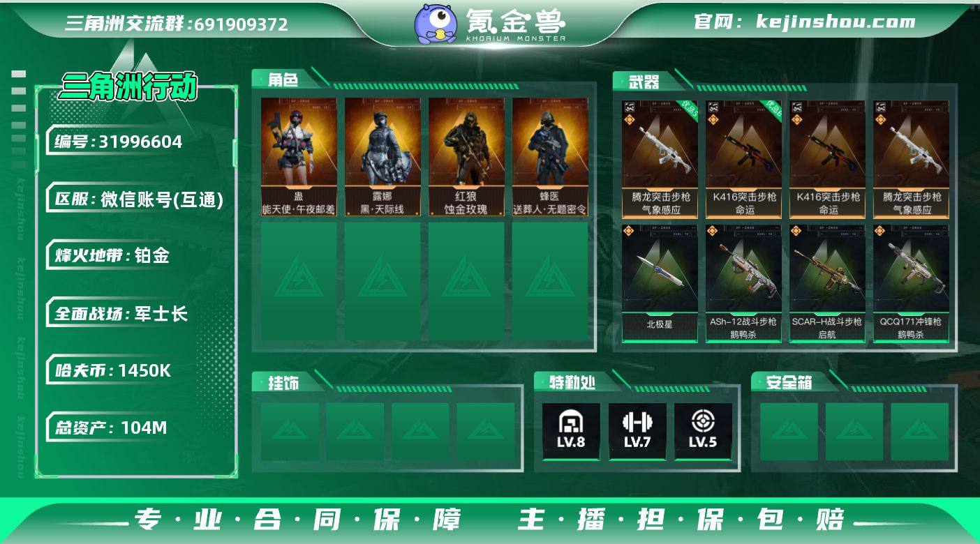 【双红皮+北极星+优品S腾龙】104m总资产-1450k哈伏币-60烽火等级-铂金-50战场等级-军士长 【干员外观】:红狼-蚀金玫瑰,露娜-黑·天际线,蛊-能天使午夜邮差,蜂医-送葬人·无题密令 【近战皮肤】:近战-北极星,近战-黑鹰 【典藏外观】:K416突击步枪-命运,腾龙突击步枪-气象感应 【典藏外观成色】:K416突击步枪-命运(优品B),腾龙突击步枪-气象感应(优品S) 【传说外观】:M4A1突击步枪-蚀金玫瑰,M4A1突击步枪-阿米娅,ASh-12战斗步枪-鹅鸭杀,M16A4突击步枪-狩猎时刻,M7战斗步枪-小肥柴,SG552突击步枪-小肥柴,AK-12突击步枪-特斯拉线圈,SCAR-H战斗步枪-启航,G3战斗步枪-狩猎时刻,CAR-15突击步枪-阿米娅,K437突击步枪-北极星,Vector冲锋枪-狩猎时刻,Vector冲锋枪-能天使-午夜邮差,UZI冲锋枪-特斯拉线圈,SR-3M紧凑突击步枪-特斯拉线圈,勇士冲锋枪-能天使-午夜邮差,QCQ171冲锋枪-北极星,QCQ171冲锋枪-鹅鸭杀,725双管霰弹枪-送葬人-无题密令,M250通用机枪-骑士之心,QJB201轻机枪-鹅鸭杀,SVD狙击步枪-小肥柴,复合弓-黑·天际线 【史诗外观】:Ash-12战斗步枪-飓风行动,K416突击步枪-暗鸦,K437突击步枪-私人定制*3,AWM狙击步枪-私人定制*2,P90冲锋枪-天命,AKM突击步枪-林中猎手,QBZ95-1突击步枪-曙光,M16A4突击步枪-竞赛选手,SCAR-H战斗步枪-囚徒,AS Val突击步枪-典狱官,腾龙突击步枪-无垢,MP5冲锋枪-深海恐惧,MP5冲锋枪-战术竞备,SR-3M紧凑突击步枪-荒野求生,SR-3M紧凑突击步枪-战术竞备,勇士冲锋枪-深海恐惧,勇士冲锋枪-工业狂潮,MP7冲锋枪-无垢,MP7冲锋枪-守护者,M1014霰弹枪-林中猎手,PKM通用机枪-荒野求生,SVD狙击步枪-阿萨拉工艺,SVD狙击步枪-暗夜猎手,SVD狙击步枪-荒野求生,PSG-1射手步枪-无垢,SV-98狙击步枪-林中猎手,SV-98狙击步枪-囚徒,R93狙击步枪-竞赛选...