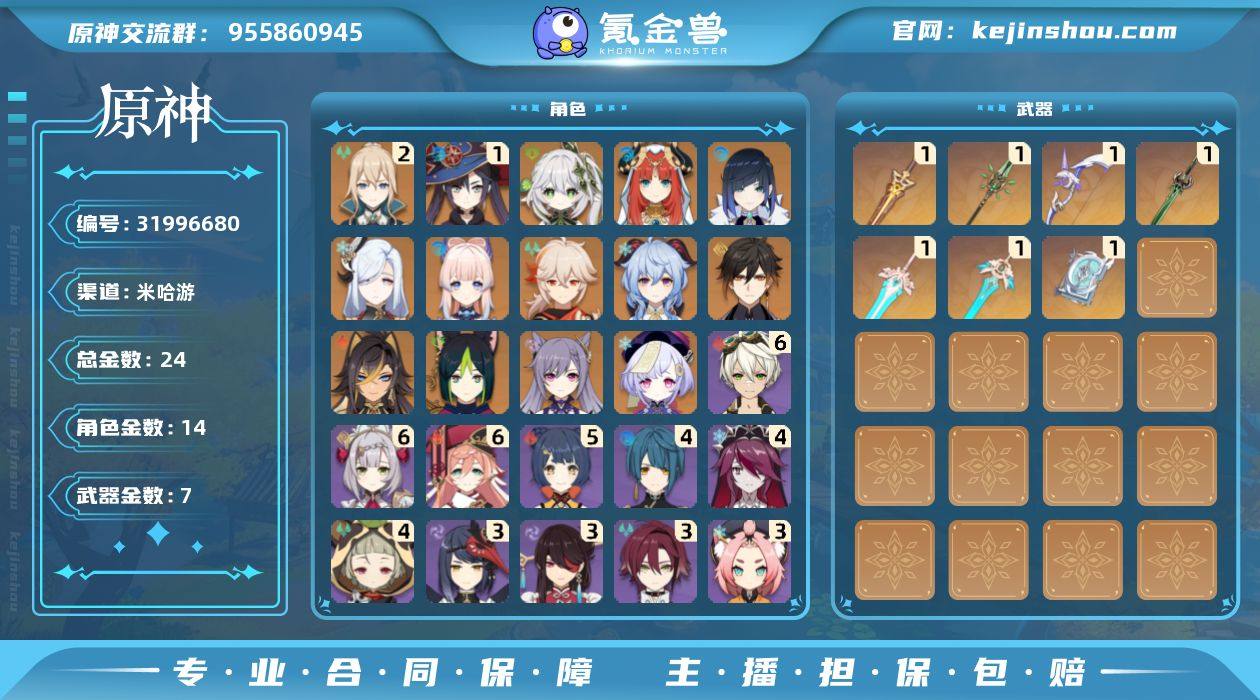 冒险等级:60 总黄数:24 5星角色数:14 5星武器数:7 原石数量:25937 相遇之缘数量:8 纠缠之源数量:57 2命琴,1命莫娜,0命纳西妲,0命妮露,0命夜兰,0命申鹤,0命珊瑚宫心海,0命枫原万叶,0命甘雨,0命钟离,0命迪希雅,0命提纳里,0命刻晴,0命七七 6命班尼特,6命诺艾尔,6命烟绯,5命香菱,4命行秋,4命罗莎莉亚,4命早柚,3命北斗,3命迪奥娜,3命菲谢尔,3命九条裟罗,3命雷泽,3命鹿野院平藏,2命久岐忍,2命卡齐娜,2命芭芭拉,2命重云,2命多莉,2命柯莱,2命莱依拉,2命凝光,2命五郎,2命辛焱,2命云堇,1命绮良良,1命凯亚,1命丽莎,1命米卡,1命托马,1命瑶瑶,0命菲米尼,0命琳妮特,0命安柏,0命珐露珊,0命卡维,0命坎蒂丝,0命砂糖 精1圣显之钥,精1和璞鸢,精1阿莫斯之弓,精1磐岩结绿,精1天空之傲,精1天空之刃,精1四风原典 100%侦察骑士,古恩希尔德的传承,帆影游风,星与月之约,叶隐芳名,致教会自由人