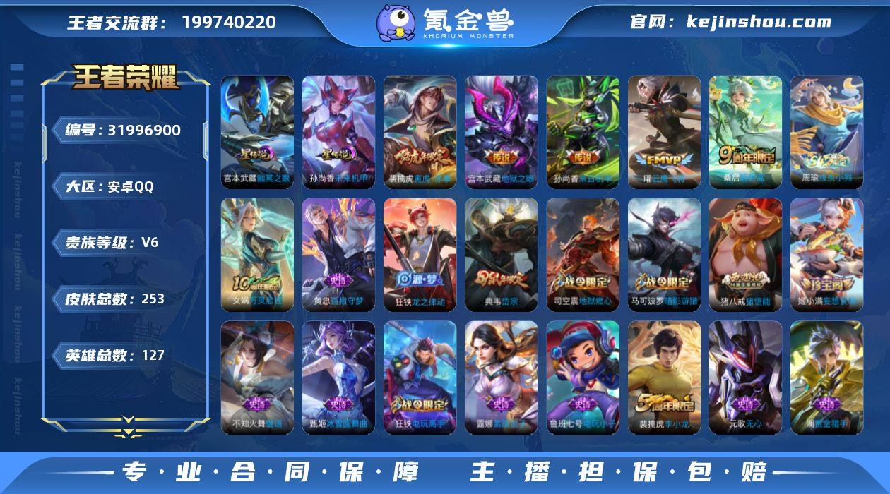 实名: 可修改 贵族等级: V6 英雄数: 127 皮肤数: 253 星传说: 未来机甲,幽冥之眼 传说皮: 云鹰飞将,末日机甲-孙尚香,地狱之眼 限定皮: 李小龙,岱宗,逐梦之影,寅虎·御盾,高山流水,猪悟能,寅虎·赤拳,五谷丰年,鸣野蒿