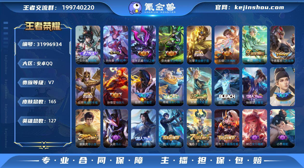【秒换绑】安卓Q-V7-永恒钻石II段位-127英雄-165皮肤-1无双-9传说-39史诗 【英雄全皮】:孙权全皮 【无双皮肤】:公孙离离恨烟 【传说皮肤】:云缨幻光神枪,桑启鸣野蒿,后羿无尽星芒,干将莫邪久胜战神,达摩黄金狮子座,后羿黄金射手座,孙尚香末日机甲,宫本武藏地狱之眼,孙悟空地狱火 【限定皮肤】:公孙离离恨烟,姜子牙天穹之誓,李白谪仙醉月,狄仁杰阴阳师,赵云皇家上将,墨子神迹守卫,嬴政优雅恋人,庄周高山流水,元歌无心,狄仁杰魔术师,狄仁杰万华元夜,达摩沙漠行僧,项羽海滩派对,老夫子醍醐杖,老夫子航海奇遇记,程咬金演武夺筹,兰陵王金庭之子,孙悟空至尊宝,后羿如梦令,后羿圣弓游侠,后羿无尽星芒,李元芳银河之约,李元芳云中旅人,钟馗驱傩正仪,干将莫邪胡桃夹子,鬼谷子原初探秘者,鬼谷子五谷丰年,苏烈千军破阵,弈星混沌棋,沈梦溪星空之诺,沈梦溪大漠名商,明世隐疑决卦,裴擒虎李小龙,云中君纤云弄巧,上官婉儿梁祝,嫦娥拒霜思,鲁班大师探海日志,桑启海盐诗旅 【赛季限定】:弈星混沌棋,明世隐疑决卦,老夫子醍醐杖,鬼谷子原初探秘者,狄仁杰万华元夜,程咬金演武夺筹,钟馗驱傩正仪,苏烈千军破阵,达摩沙漠行僧,兰陵王金庭之子,沈梦溪大漠名商,李元芳云中旅人,桑启海盐诗旅,鲁班大师探海日志,姜子牙天穹之誓,东皇太一噬灭天穹,太乙真人谧流熔炉,钟馗虚灵犬护,甄姬逆浪荇歌,亚瑟荣光之誓 【战令限定】:李元芳银河之约,沈梦溪星空之诺,老夫子航海奇遇记,墨子神迹守卫,后羿圣弓游侠,周瑜线条小狗 【史诗皮肤】:周瑜线条小狗,女娲万灵启世,后羿石田雨龙,李白谪仙醉月,元歌无心,鬼谷子五谷丰年,嫦娥拒霜思,庄周高山流水,老夫子航海奇遇记,云中君纤云弄巧,裴擒虎李小龙,小乔青蛇,后羿如梦令,李元芳银河之约,上官婉儿梁祝,狄仁杰鹰眼统...
