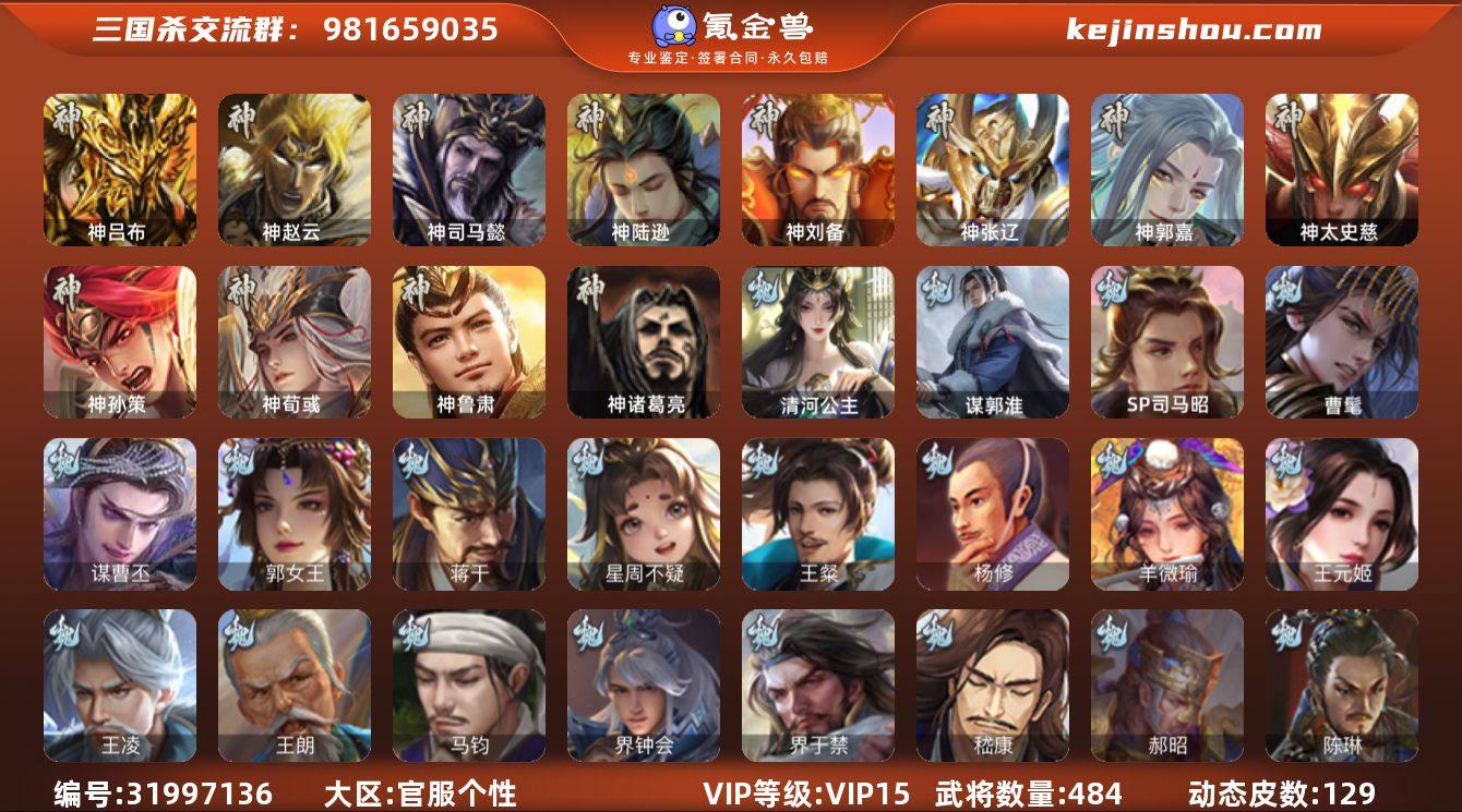 官阶:大将军;VIP等级:VIP15;史诗武将数量:0;动态皮肤数量:129;武将总数:484;史诗宝珠数量:0;将魂数量:0;神将:15;魏国史诗武将:67;蜀国史诗武将:112;吴国史诗武将:106;群史诗武将:126