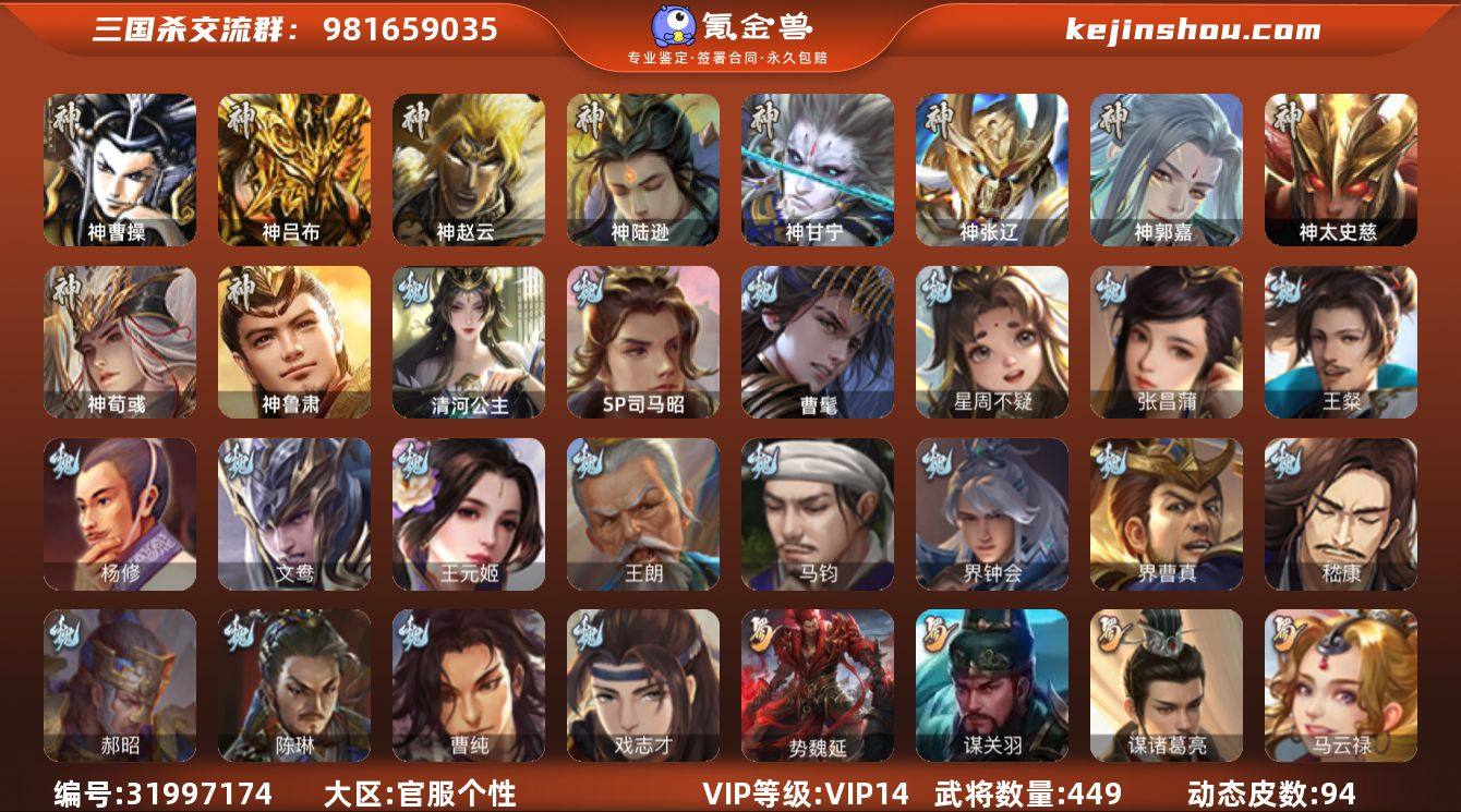 官阶:大将军;VIP等级:VIP14;史诗武将数量:79;动态皮肤数量:94;武将总数:449;史诗宝珠数量:94;将魂数量:10058;神将:12;魏国史诗武将:26;蜀国史诗武将:15;吴国史诗武将:10;群史诗武将:29 神曹操,神吕布,神赵云,神陆逊,神甘宁,神张辽,神郭嘉,神太史慈,神荀彧,神吕蒙,神周瑜,神鲁肃,SP司马昭,曹髦,星周不疑,张昌蒲,王粲,杨修,文鸯,王元姬,王朗,魏-司马昭,马钧,界钟会,界曹真,嵇康,郝昭,陈琳,曹纯,戏志才,清河公主,关索,谋诸葛亮,马云騄,谋赵云,谋马超,诸葛瞻,周群,赵襄,沙摩柯,谯周,界黄忠,花鬘,董允,谋关羽,势魏延,谋黄盖,周处,吴景,孙寒华,骆统,留赞,界朱然,界徐盛,界步练师,势太史慈,谋黄月英,十常侍,谋貂蝉,界沮授,左慈,郑玄,张让,杨彪,星黄忠,王允,司马徽,审配,麹义,南华老仙,祢衡,刘焉,沮授,界左慈,界李儒,公孙康,杜预,卑弥呼,鲍信,张绣,阎象,许攸,陈珪,友徐庶,星董卓,神郭嘉-虎年清明(动态),神荀彧-虎年清明(动态),神荀彧-匡汉延祚(动态),神刘备-龙兴海内,神张辽-散敌擒孙,神甘宁-万人辟易(动态),神曹操-天下归心,神曹操-玄天通冥(动态),神吕布-监兵噬魅(动态),神赵云-战龙在野(动态),张昌蒲-龙年端午(动态),钟会-龙年端午(动态),曹丕-气荡山河(动态),SP蔡文姬-兔年冬日(动态),荀彧-驱虎吞狼(动态),钟会-谋谟之勋(动态),曹真-虎年春节(动态),界钟会-谋谟之勋(动态),戏志才-举棋若定(动态),曹纯-虎年春节(动态),王元姬-鼠年冬至(动态),司马昭-昭威淮南(动态),清河公主-魅影萦心(动态),刘备-龙御天下(动态),诸葛亮-龙年限定(动态),卧龙诸葛-龙跃凤鸣(动态),关羽-明良千古(动态),马超-牛年春节(动态),马超-虎年冬至(动态),马超-明良千古(动态),张飞-据水断桥(动态),张飞-明良千古(动态),赵云-明亮千古(动态),诸葛亮-明良千古(动态),界张飞-据水断桥(动态),界马超-牛年春节(动态),界诸葛亮-明良...