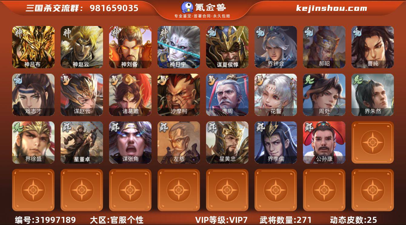 官阶:骠骑将军;VIP等级:VIP7;史诗武将数量:26;动态皮肤数量:25;武将总数:271;史诗宝珠数量:1;将魂数量:2065;神将:6;魏国史诗武将:18;蜀国史诗武将:5;吴国史诗武将:3;群史诗武将:8 神吕布,神赵云,神刘备,神甘宁,神吕蒙,神周瑜,界钟会,郝昭,曹纯,戏志才,谋夏侯惇,谋赵云,诸葛瞻,沙摩柯,谯周,花鬘,周处,界朱然,界徐盛,左慈,星黄忠,麹义,界李儒,公孙康,鲍信,谋张角,星董卓,神荀彧-匡汉延祚(动态),星周不疑-才广志宏(动态),星周不疑-龙年清明(动态),甄姬-明珠耀躯(动态),钟会-谋谟之勋(动态),曹真-虎年春节(动态),界钟会-谋谟之勋(动态),曹昂-竭战麟伤(动态),曹纯-虎年春节(动态),星徐晃-斧引霹雳(动态),诸葛亮-龙年限定(动态),周处-义除三害(动态),吕蒙-剑起惊澜(动态),孙寒华-莲华熠熠(动态),孙权-吴王六剑(动态),界孙权-吴王六剑(动态),麹义-扬刀立威(动态),李儒-鸠杀少帝(动态),界李儒-鸠杀少帝(动态),何太后-蛇蝎为心(动态)
