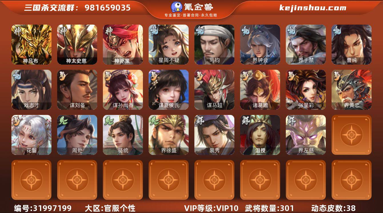 官阶:大将军;VIP等级:VIP10;史诗武将数量:41;动态皮肤数量:40;武将总数:389;史诗宝珠数量:0;将魂数量:0;神将:6;魏国史诗武将:21;蜀国史诗武将:8;吴国史诗武将:4;群史诗武将:14 神吕布,神赵云,神甘宁,神关羽,神吕蒙,神诸葛亮,王粲,杨修,马钧,界钟会,界于禁,嵇康,郝昭,陈琳,曹纯,戏志才,刘晔,谋刘备,马云騄,谋马超,周群,赵襄,张星彩,沙摩柯,界黄忠,骆统,界朱然,界徐盛,界步练师,左慈,郑玄,张让,麹义,南华老仙,沮授,界左慈,界李儒,公孙康,谋张角,张绣,李傕,许攸,星董卓,神荀彧-匡汉延祚(动态),神甘宁-万人辟易(动态),神诸葛亮-孟章诛邪(动态),神曹操-天下归心,神吕布-冠绝天下(动态),钟会-潜蛟觊天(动态),星周不疑-龙年清明(动态),郭嘉-十胜十败(动态),荀彧-驱虎吞狼(动态),邓艾-神兵天降(动态),界郭嘉-十胜十败(动态),界邓艾-神兵天降(动态),曹昂-竭战麟伤(动态),戏志才-举棋若定(动态),朱灵-以战破氐(动态),曹纯-长坂败备(动态),星徐晃-斧引霹雳(动态),马超-牛年春节(动态),黄忠-明良千古(动态),界马超-牛年春节(动态),卧龙诸葛-火烧博望(动态),吕蒙-剑起惊澜(动态),孙策-虎踞江东(动态),孙权-猪年端午(动态),孙尚香-兔年春节(动态),孙策-猪年七夕(动态),界孙权-猪年端午(动态),界孙策-猪年七夕(动态),徐盛-破军杀将(动态),麹义-扬刀立威(动态),左慈-役使鬼神(动态),许攸-恃功矜能(动态)