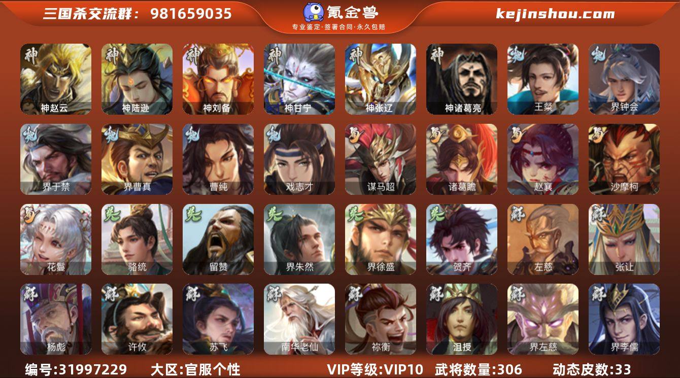 官阶:骠骑将军;VIP等级:VIP10;史诗武将数量:35;动态皮肤数量:33;武将总数:306;史诗宝珠数量:3;将魂数量:3697;神将:7;魏国史诗武将:19;蜀国史诗武将:5;吴国史诗武将:5;群史诗武将:14