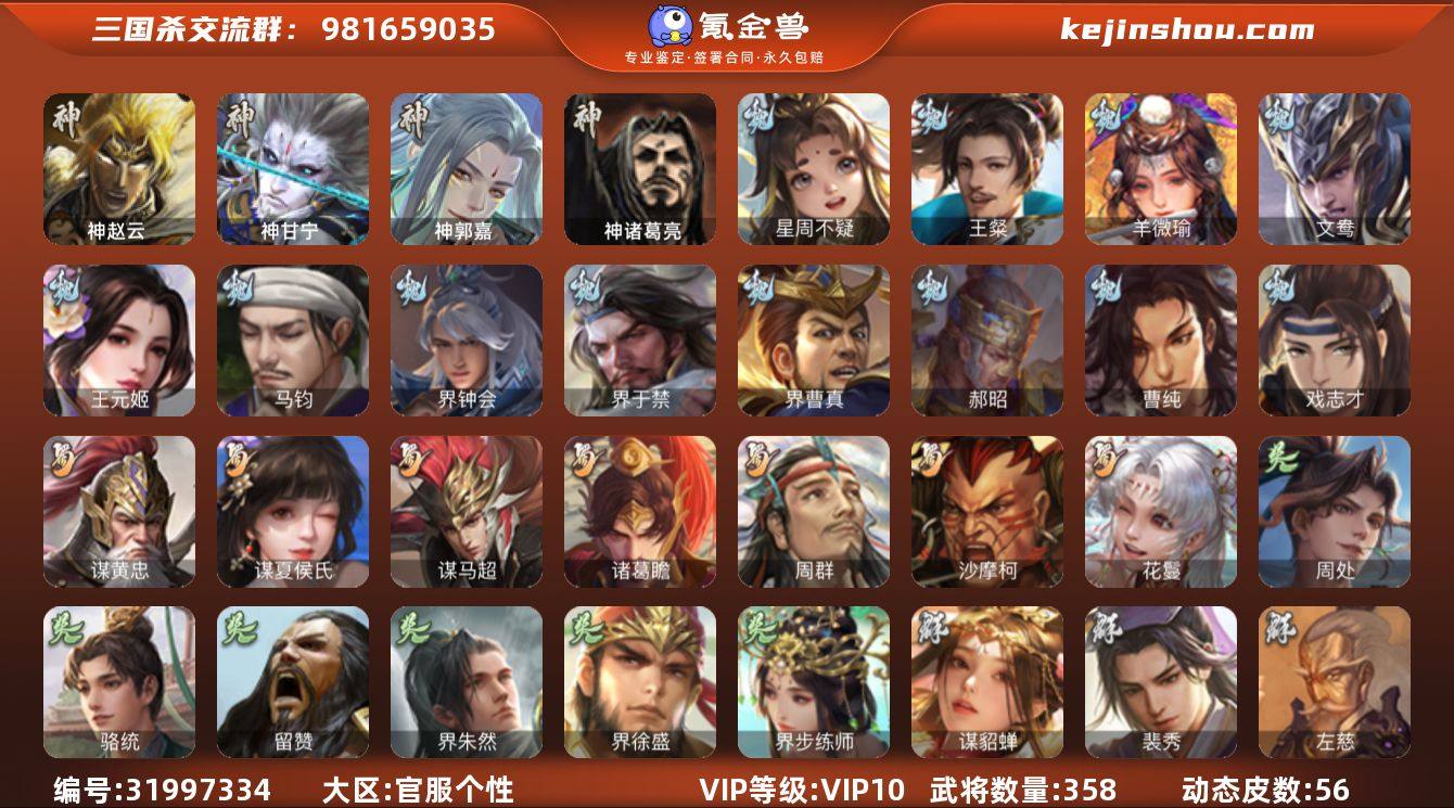 官阶:大将军;VIP等级:VIP10;史诗武将数量:45;动态皮肤数量:56;武将总数:358;史诗宝珠数量:12;将魂数量:5741;神将:6;魏国史诗武将:28;蜀国史诗武将:7;吴国史诗武将:6;群史诗武将:17 神赵云,神甘宁,神郭嘉,神吕蒙,神周瑜,神诸葛亮,星周不疑,王粲,羊徽瑜,文鸯,王元姬,马钧,界钟会,界于禁,界曹真,郝昭,曹纯,戏志才,谋黄忠,谋夏侯氏,谋马超,诸葛瞻,周群,沙摩柯,花鬘,周处,骆统,留赞,界朱然,界徐盛,界步练师,谋貂蝉,裴秀,左慈,张仲景,张让,星黄忠,苏飞,麹义,南华老仙,沮授,界左慈,界李儒,公孙康,卑弥呼,张绣,李傕,许攸,神郭嘉-虎年清明(动态),神赵云-战龙在野(动态),曹丕-气荡山河(动态),星周不疑-龙年清明(动态),SP蔡文姬-兔年冬日(动态),许褚-虎啸生风(动态),荀彧-驱虎吞狼(动态),曹丕-猪年端午(动态),邓艾-神兵天降(动态),王粲-笔翰如流(动态),界许褚-虎啸生风(动态),界邓艾-神兵天降(动态),钟会-谋谟之勋(动态),曹真-虎年春节(动态),界钟会-谋谟之勋(动态),戏志才-举棋若定(动态),羊徽瑜-牛年中秋(动态),刘备-龙御天下(动态),马超-牛年春节(动态),黄忠-明良千古(动态),界马超-牛年春节(动态),马云騄-牛年春节(动态),关索-虎年七夕(动态),鲍三娘-柳娇桃艳(动态),李丰-太仓聚粟(动态),胡金定-明良千古(动态),周处-义除三害(动态),孙权-永开吴祚(动态),孙权-牛年七夕(动态),孙尚香-星流霆击(动态),界孙权-牛年七夕(动态),界孙尚香-星流霆击(动态),徐盛-破军杀将(动态),步练师-牛年七夕(动态),界步练师-牛年七夕(动态),孙茹-烟水悠悠(动态),刘赞-灵魂歌王(动态),灵雎-霜刃绚练(动态),貂蝉-鼠年七夕(动态),吕布-傲睨万物(动态),袁绍-一往无前(动态),许攸-盛气凌人(动态),谋刘赪-明良千古(动态),界貂蝉-鼠年七夕(动态),李儒-鸠杀少帝(动态),界李儒-鸠杀少帝(动态),苏飞-肝胆相照(动态),星甘宁-肝胆相照(动态)