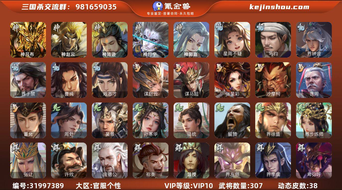 官阶:大将军;VIP等级:VIP10;史诗武将数量:48;动态皮肤数量:58;武将总数:379;史诗宝珠数量:18;将魂数量:2055;神将:5;魏国史诗武将:30;蜀国史诗武将:10;吴国史诗武将:8;群史诗武将:15 神吕布,神赵云,神陆逊,神郭嘉,神吕蒙,星周不疑,杨修,王元姬,王朗,界钟会,界曹真,嵇康,郝昭,曹纯,戏志才,蒋干,马云騄,谋赵云,谋马超,诸葛瞻,赵襄,沙摩柯,谯周,花鬘,董允,鲍三娘,谋黄盖,吴景,孙寒华,骆统,界朱然,界徐盛,界步练师,贺齐,左慈,星黄忠,苏飞,审配,麹义,庞德公,南华老仙,沮授,界左慈,界李儒,公孙康,鲍信,谋张角,李傕,许攸,神郭嘉-虎年清明(动态),神吕蒙-兼资文武(动态),神赵云-战龙在野(动态),星周不疑-才广志宏(动态),张昌蒲-龙年端午(动态),曹丕-气荡山河(动态),SP蔡文姬-兔年冬日(动态),司马懿-牛年立冬(动态),荀彧-驱虎吞狼(动态),邓艾-神兵天降(动态),王粲-笔翰如流(动态),界司马懿-牛年立冬(动态),界邓艾-神兵天降(动态),钟会-谋谟之勋(动态),界钟会-谋谟之勋(动态),曹昂-竭战麟伤(动态),戏志才-举棋若定(动态),曹纯-虎年春节(动态),清河公主-魅影萦心(动态),诸葛亮-龙年限定(动态),马超-虎年冬至(动态),诸葛瞻-绵竹之殇(动态),张星彩-虎年端午(动态),李丰-太仓聚粟(动态),胡金定-明良千古(动态),马良-荡然由心(动态),孙茹-龙年七夕(动态),周处-义除三害(动态),吕蒙-剑起惊澜(动态),孙权-永开吴祚(动态),孙策-虎踞江东(动态),孙寒华-莲华熠熠(动态),黄盖-鏖战赤壁(动态),孙权-吴王六剑(动态),界黄盖-鏖战赤壁(动态),界孙权-吴王六剑(动态),徐盛-破军杀将(动态),步练师-牛年七夕(动态),界步练师-牛年七夕(动态),刘赞-灵魂歌王(动态),灵雎-霜刃绚练(动态),麹义-扬刀立威(动态),刘协-困龙犹斗(动态),吕布-鼠年七夕(动态),许攸-盛气凌人(动态),界吕布-鼠年七夕(动态),何太后-蛇蝎为心(动态),张鲁-虎年冬至...