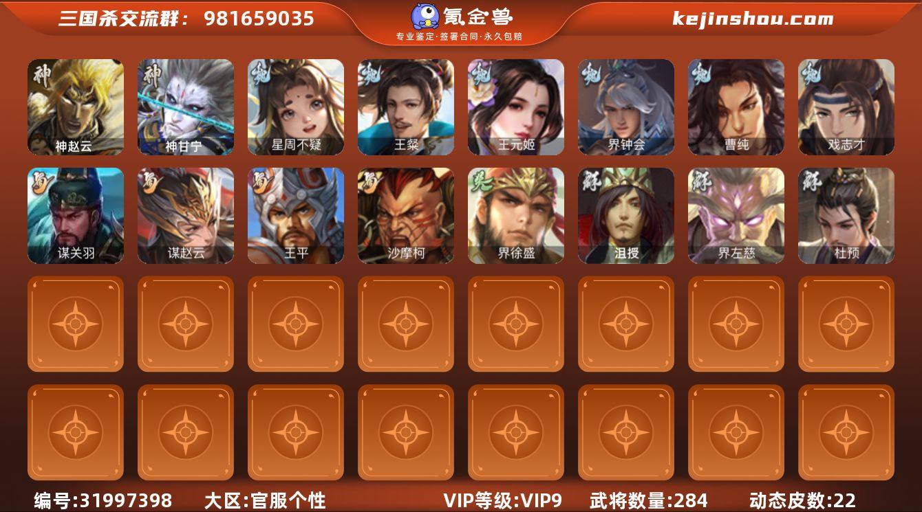 官阶:骠骑将军;VIP等级:VIP9;史诗武将数量:20;动态皮肤数量:22;武将总数:284;史诗宝珠数量:53;将魂数量:4650;神将:2;魏国史诗武将:8;蜀国史诗武将:4;吴国史诗武将:1;群史诗武将:6 神赵云,神甘宁,星周不疑,王粲,王元姬,魏-司马昭,界钟会,曹纯,戏志才,谋赵云,王平,沙摩柯,谋关羽,界徐盛,谋黄月英,谋荀彧,麹义,沮授,界左慈,杜预,神甘宁-万人辟易(动态),星周不疑-才广志宏(动态),曹丕-气荡山河(动态),SP蔡文姬-兔年冬日(动态),司马昭-昭威淮南(动态),花鬘-依心缱绻(动态),诸葛亮-龙年限定(动态),关羽-明良千古(动态),诸葛果-蛇年限定(动态),周处-义除三害(动态),孙权-永开吴祚(动态),徐盛-破军杀将(动态),麹义-扬刀立威(动态),杜预-龙吟破竹(动态),左慈-役使鬼神(动态),刘焉-雄踞益州(动态)