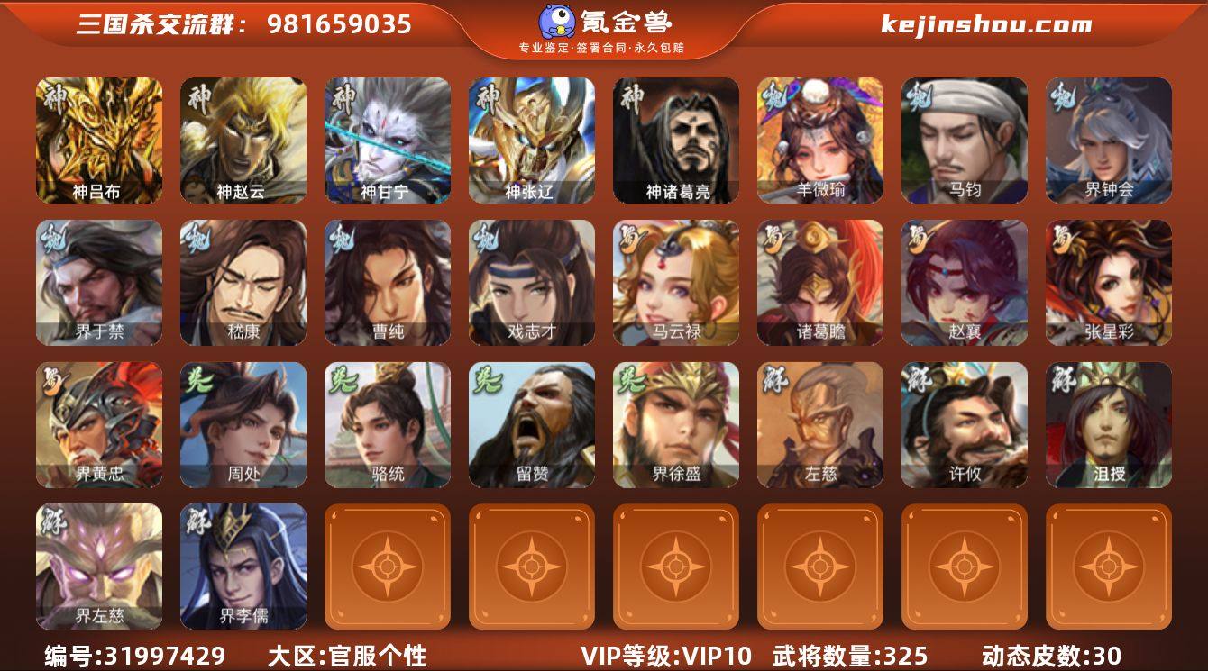 官阶:骠骑将军;VIP等级:VIP10;史诗武将数量:28;动态皮肤数量:30;武将总数:325;史诗宝珠数量:33;将魂数量:331;神将:7;魏国史诗武将:10;蜀国史诗武将:5;吴国史诗武将:4;群史诗武将:10